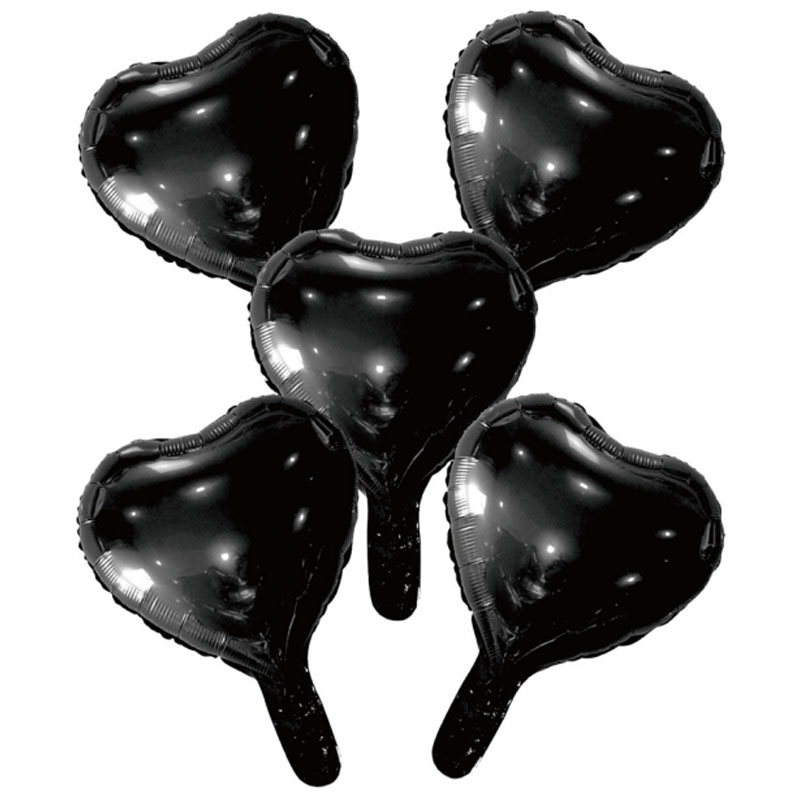 Svarta Hjärtballonger 5-pack består av 5 stycken hjärtformade folieballonger i svart, samt ett papp-rör som underlättar vid uppblåsning. Ballongerna är självförslutande och ska endast fyllas med luft. Mått: 23 x 23 cm. Säljs i 5-pack.