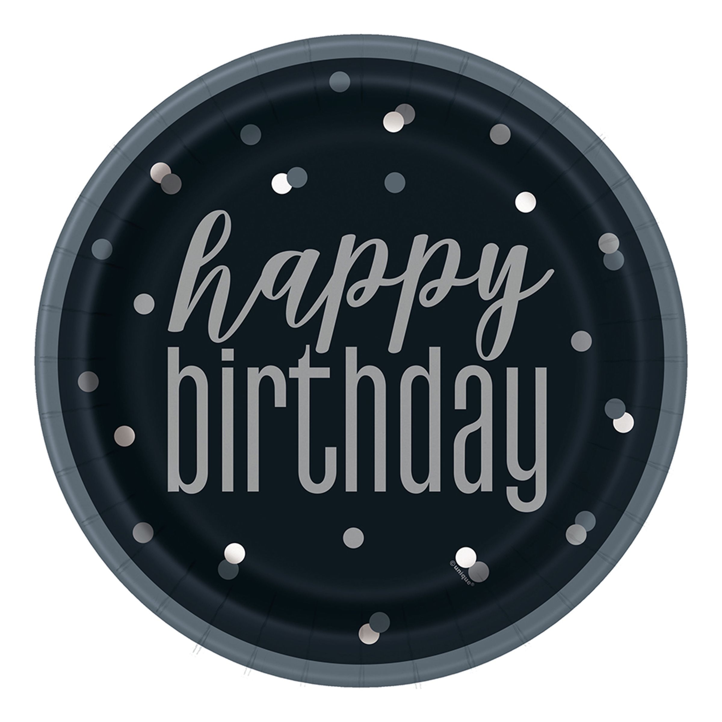 Svarta Papperstallrikar Happy Birthday passar utmärkt när det är dags att duka upp till födelsedagskalas! Det bästa av allt är att du slipper den tråkiga disken dagen efter.