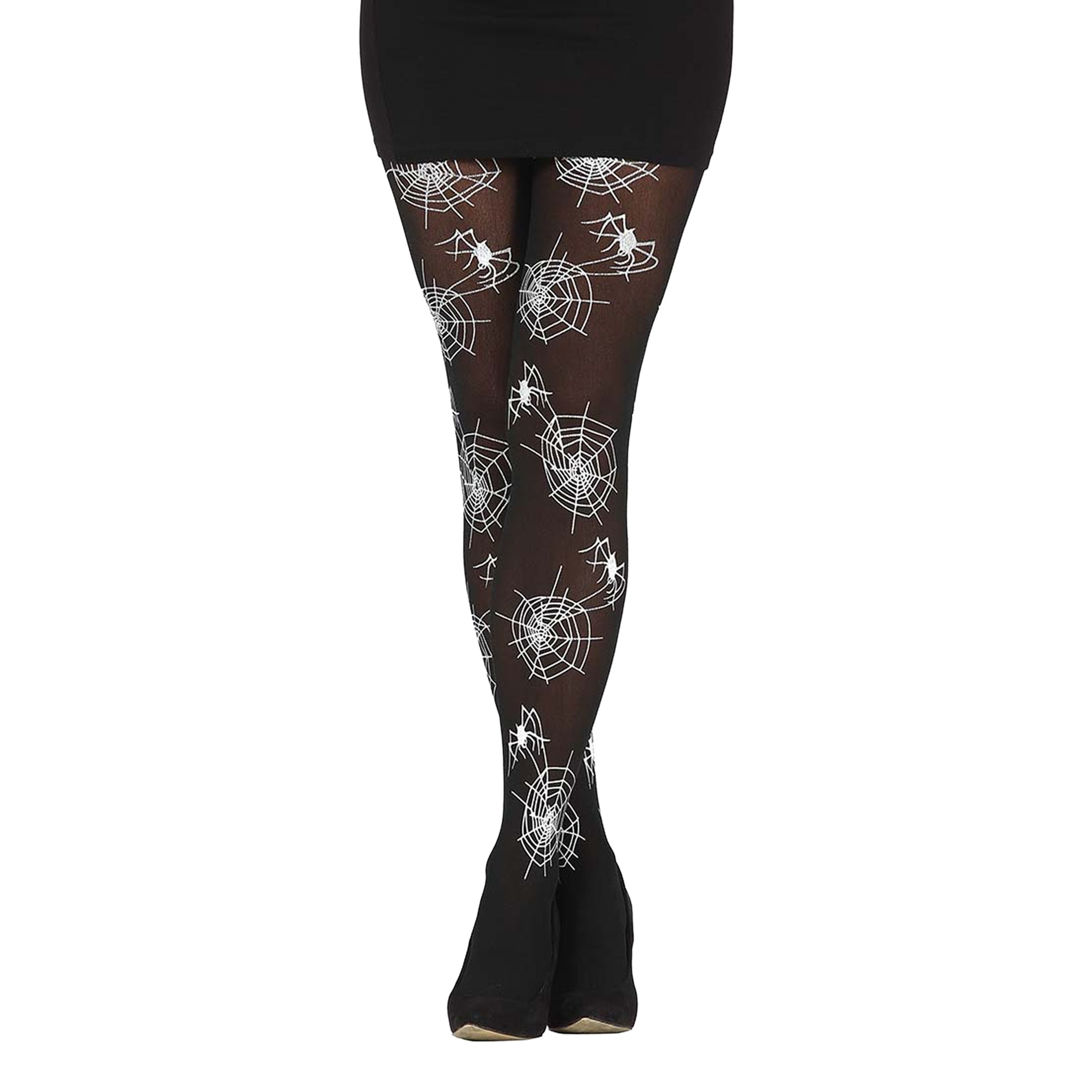 Svarta Strumpyxor med Spindelnät är ett par svarta strumpbyxor med vita motiv av spindelnät och spindlar. Klockrena strumpbyxor till din läskiga halloweenoutfit.