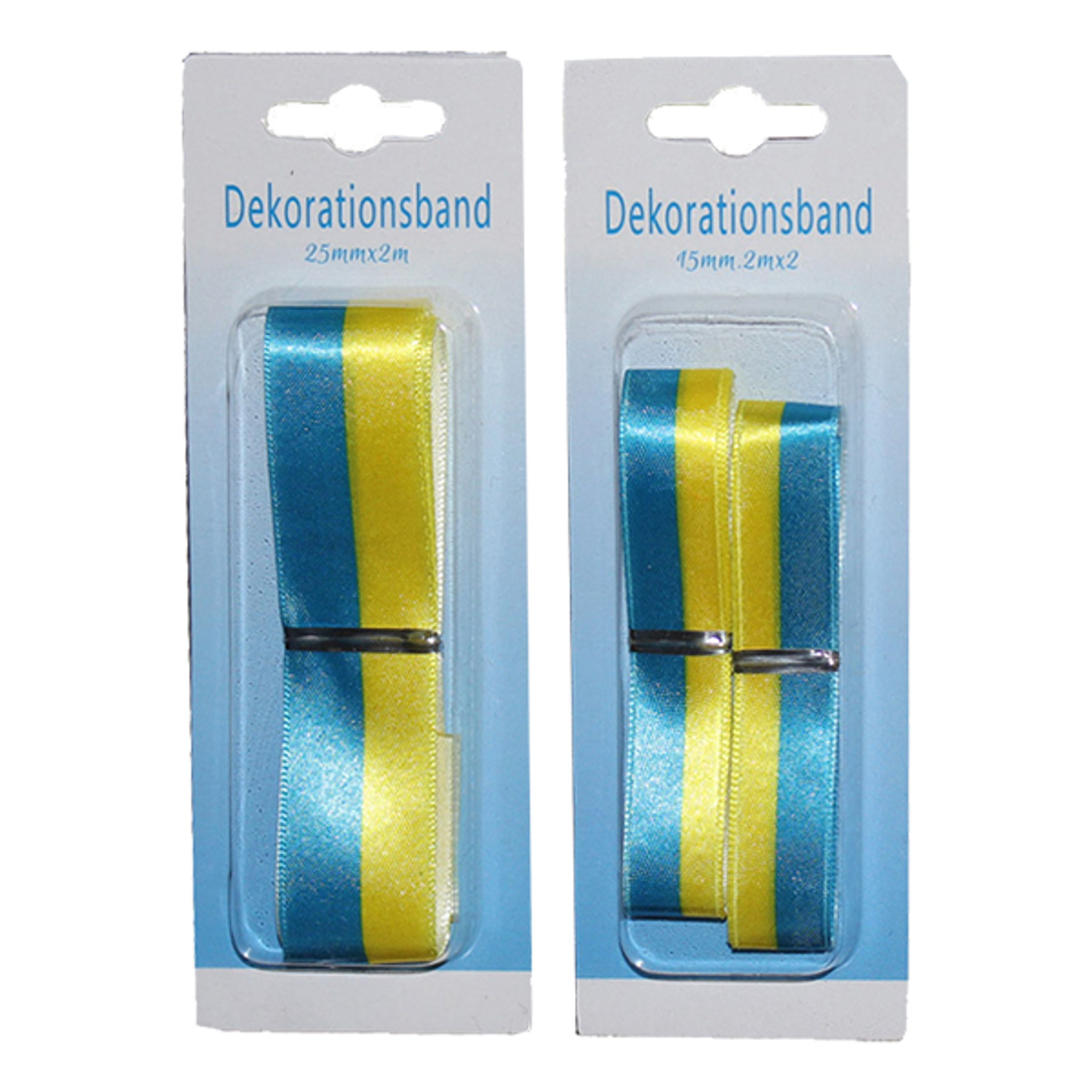 Sverigeband Blå/Gul är ett band som kommer i två olika varianter; 25 mm x 2 meter (ett band) eller 15 mm x 2 meter (två band). Båda är hälften blåa och hälften gula.