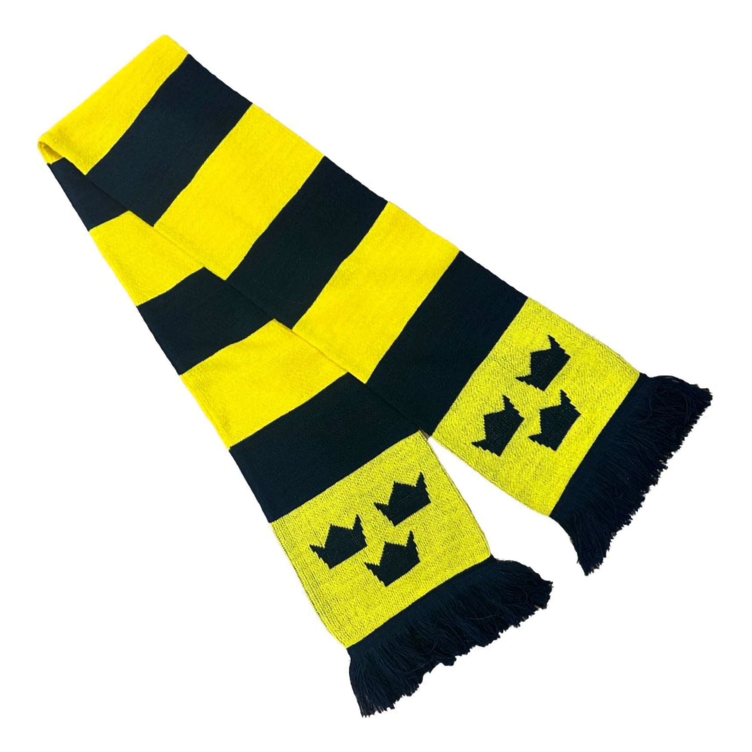 Sverigehalsduk Randig Tre Kronor är en stickad halsduk i gult och marinblått med tre kronor i ändarna. Halsduken är tillverkad av 100% akryl och kommer med fransar i båda ändar.