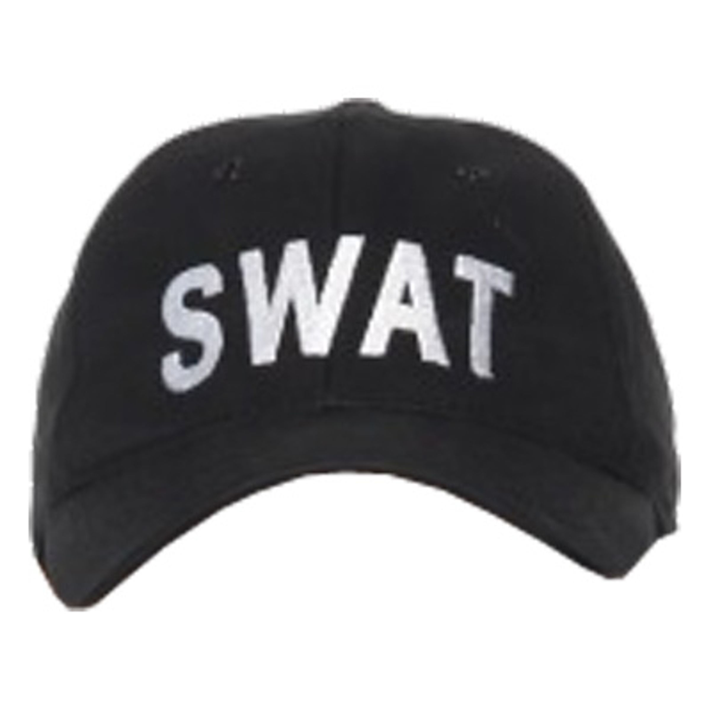 Svart standardkeps med broderad text i vitt på framsidan "SWAT". Reglerbar storlek med spänne på baksidan av kepsen. One size (vuxenstorlek).