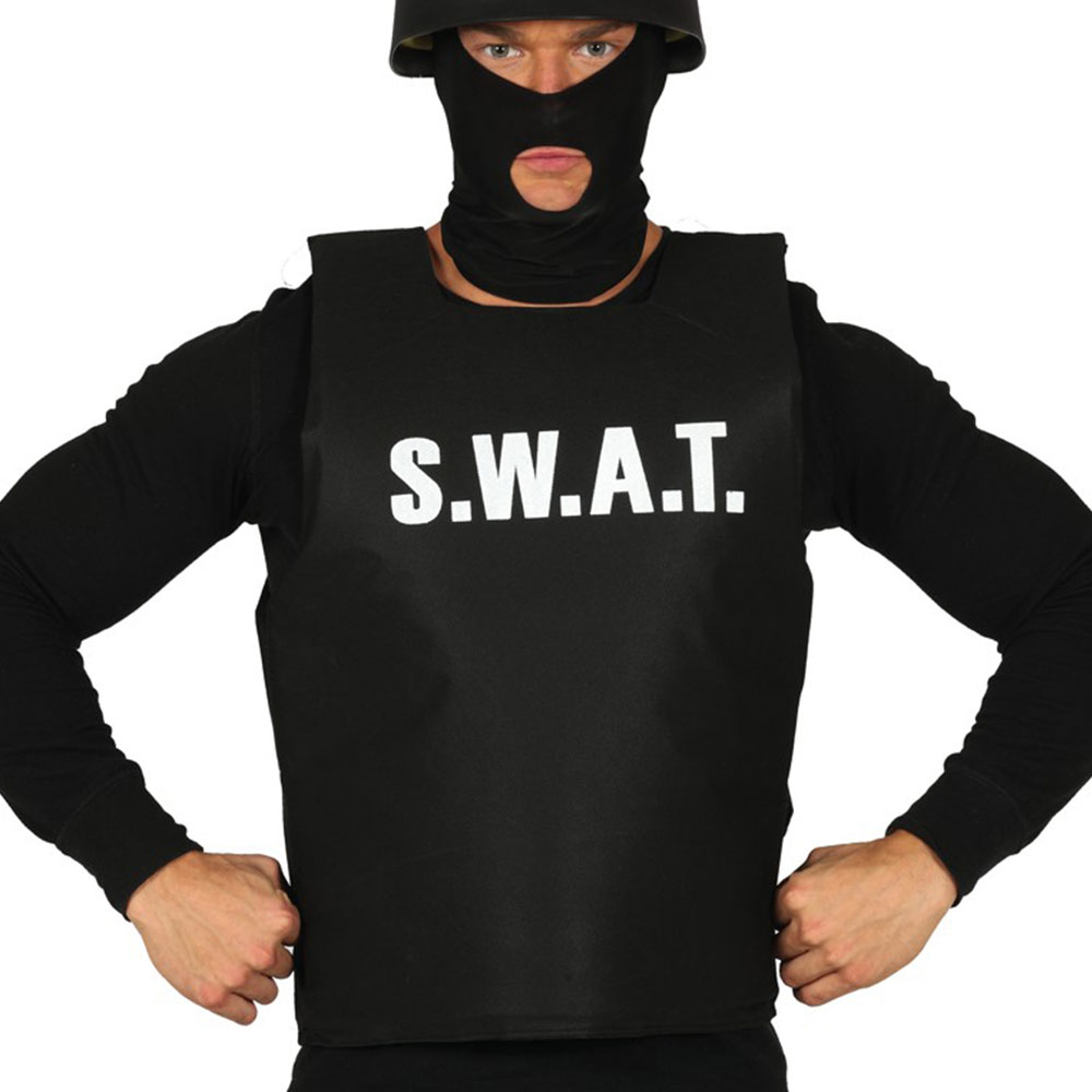 SWAT Väst Vuxen omfattar en svart väst med texten "S.W.A.T." i vitt på både fram- och baksidan.