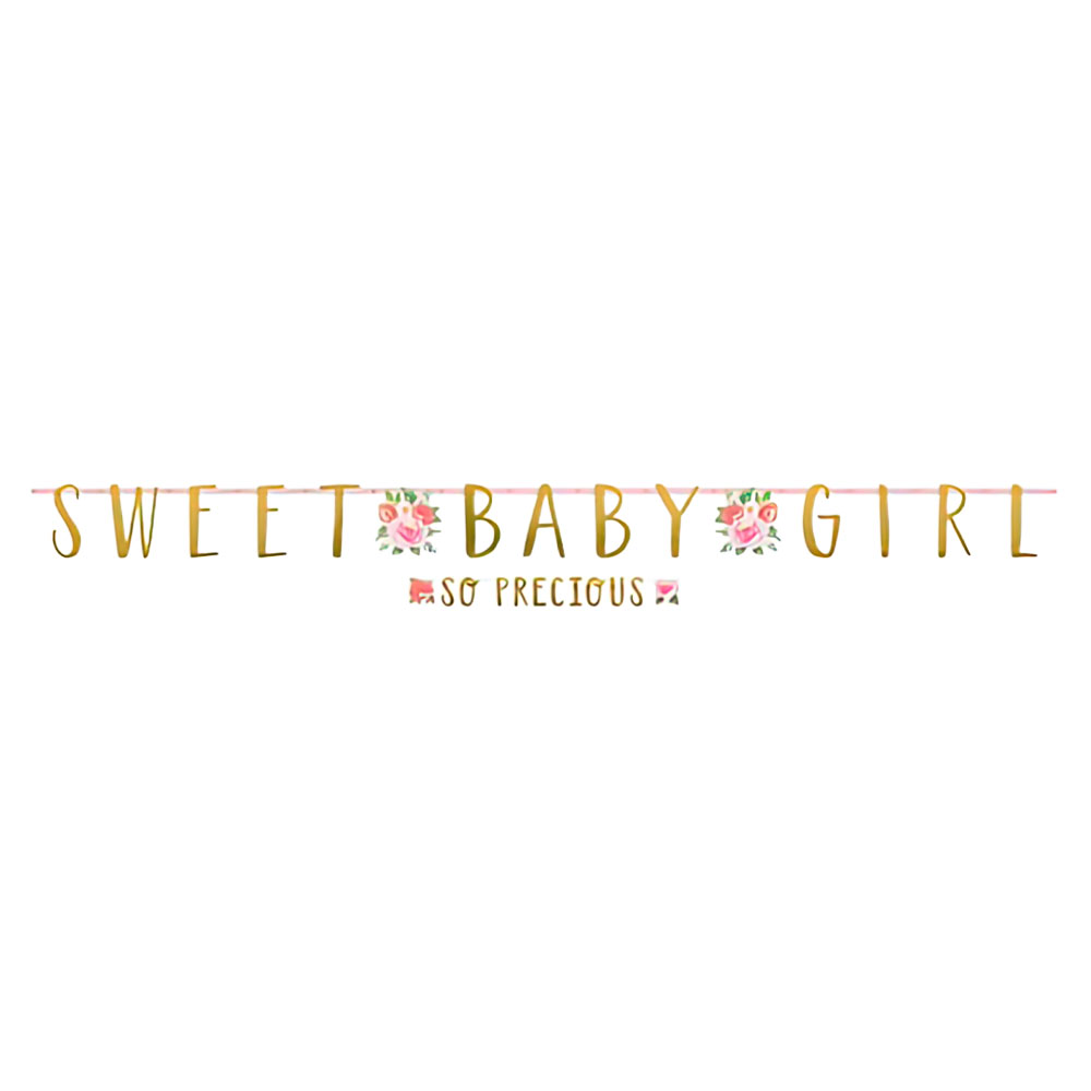 Sweet Baby Girl Girlanger DIY omfattar ett set med en stor girlang med texten "Sweet Baby Girl" och en mindre girlang med texten "So Precious". Den stora girlangen är ca 25,4 cm hög och 347 cm lång, och den mindre girlangen är ca 10 cm hög och 182 cm lång. Medföljer även ett snöre och tre blommotiv. Girlangerna sätts enkelt ihop själv.