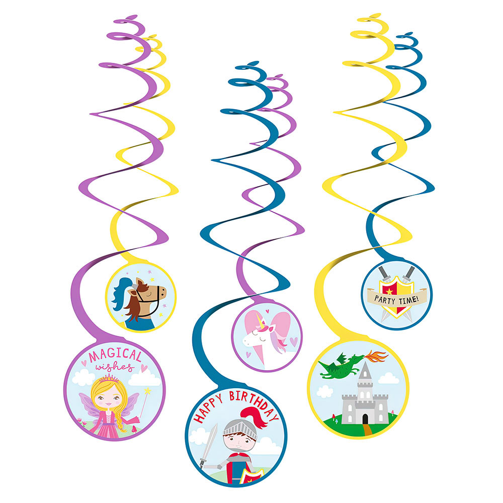 Ett roligt riddar- och prinsesskalas kan aldrig gå fel, så dekorera med dessa fina virvlande swirls och få enkelt till ett riktigt sagolikt kalas i riddar- och prinsesstema. Vackra hängande dekorationer som snyggt hänger ner från taket och sprider en fantastisk kalasstämning. Färgglada dekorationer som förvandlar hemmet till ett äkta prinsess- och riddarkalas.