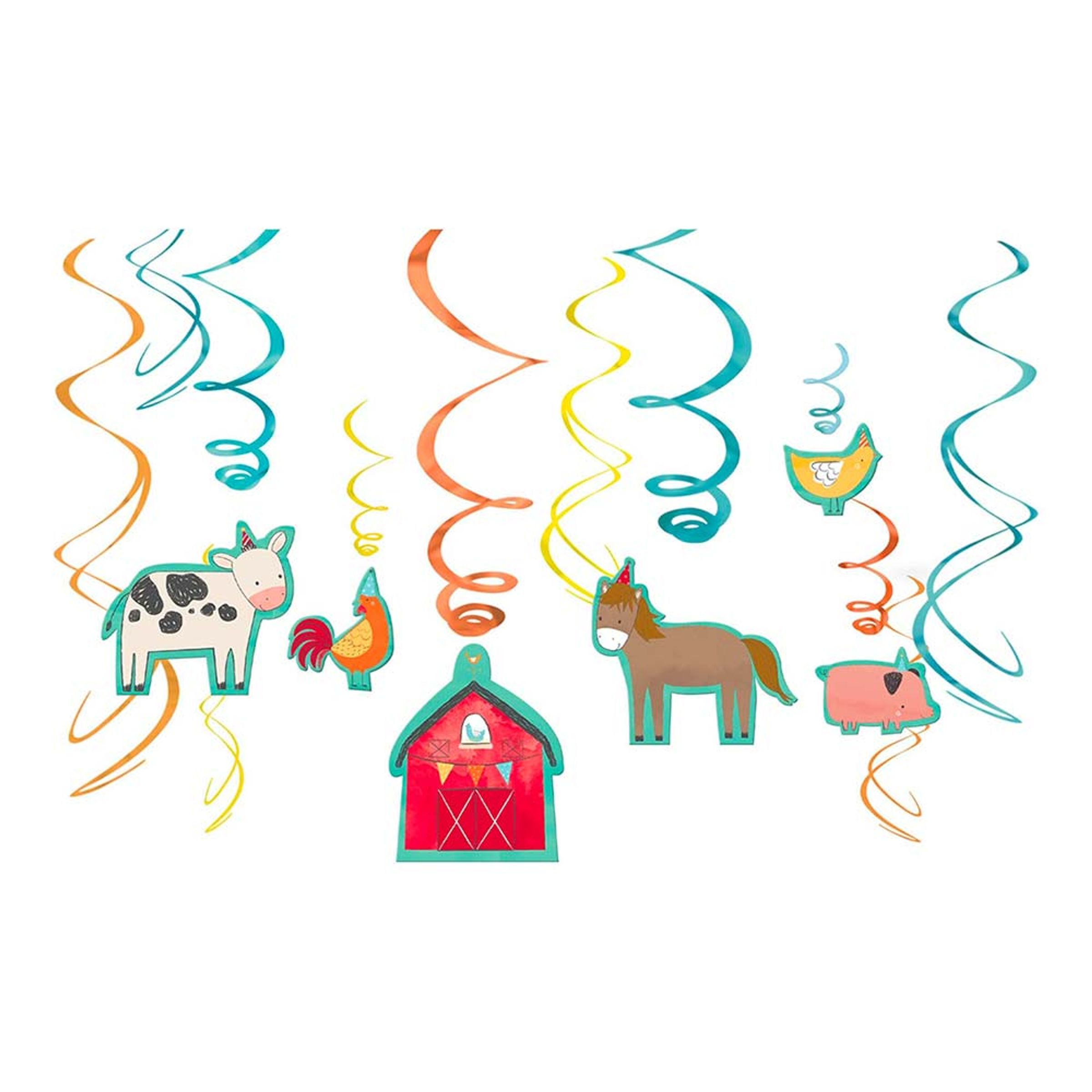 Swirls Bondgård innehåller 6 stycken dekorationer i papper som alla pryds av gulliga djur. Ett häftigt sätt att pynta kalaset till en bondgård!