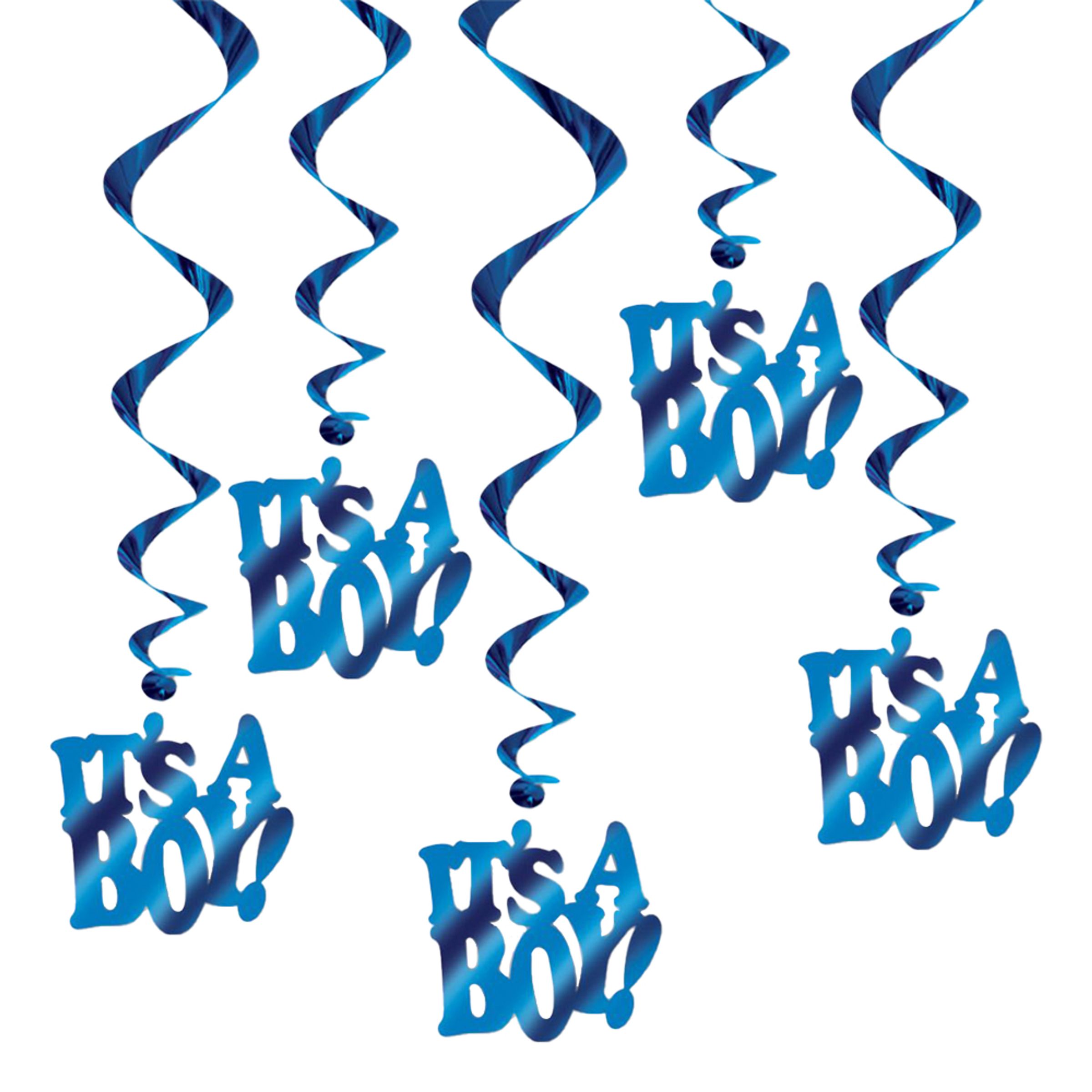 Swirls It's a Boy Blå Hängande Dekoration inkluderar fem stycken blåa dekorationer i papper. På virvlarna hänger pappfigurer med texten "It's a boy" med blåa bokstäver. Dekorationerna är tillverkade i papper och de är enkla att hänga upp med till exempel tejp.