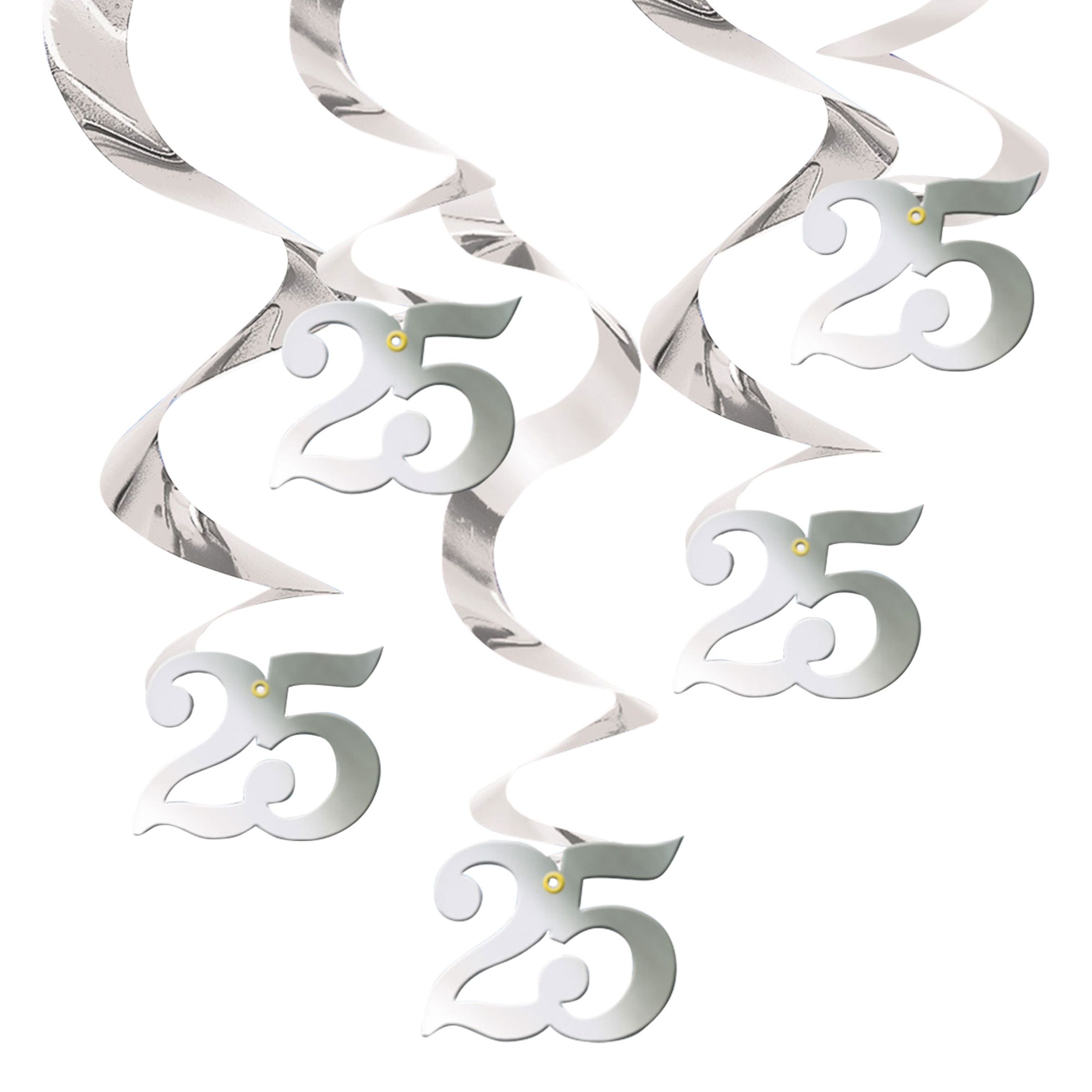 Swirls Siffra 25 Silver Takdekoration inkluderar totalt fem stycken hängande dekorationer i silver som passar utmärkt för att fira ditt silverbröllop. Matcha gärna med andra silvriga dekorationer för ett komplett tema.