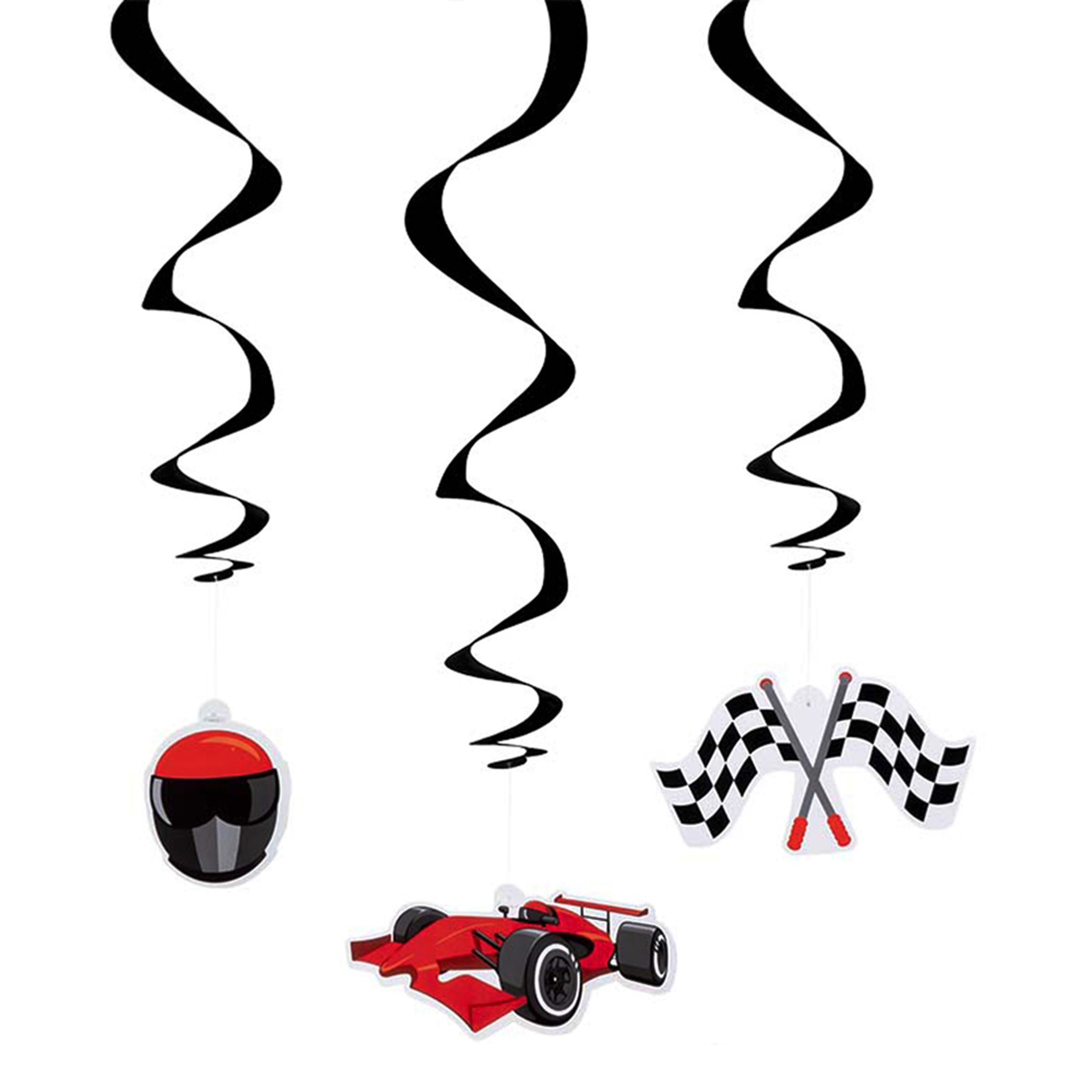Swirls Speed Hängande Dekoration innehåller 3 stycken supersnabba dekorationer i papper som tillsammans med snöre mäter 85 cm. Häng i taket och låt racingfesten börja!