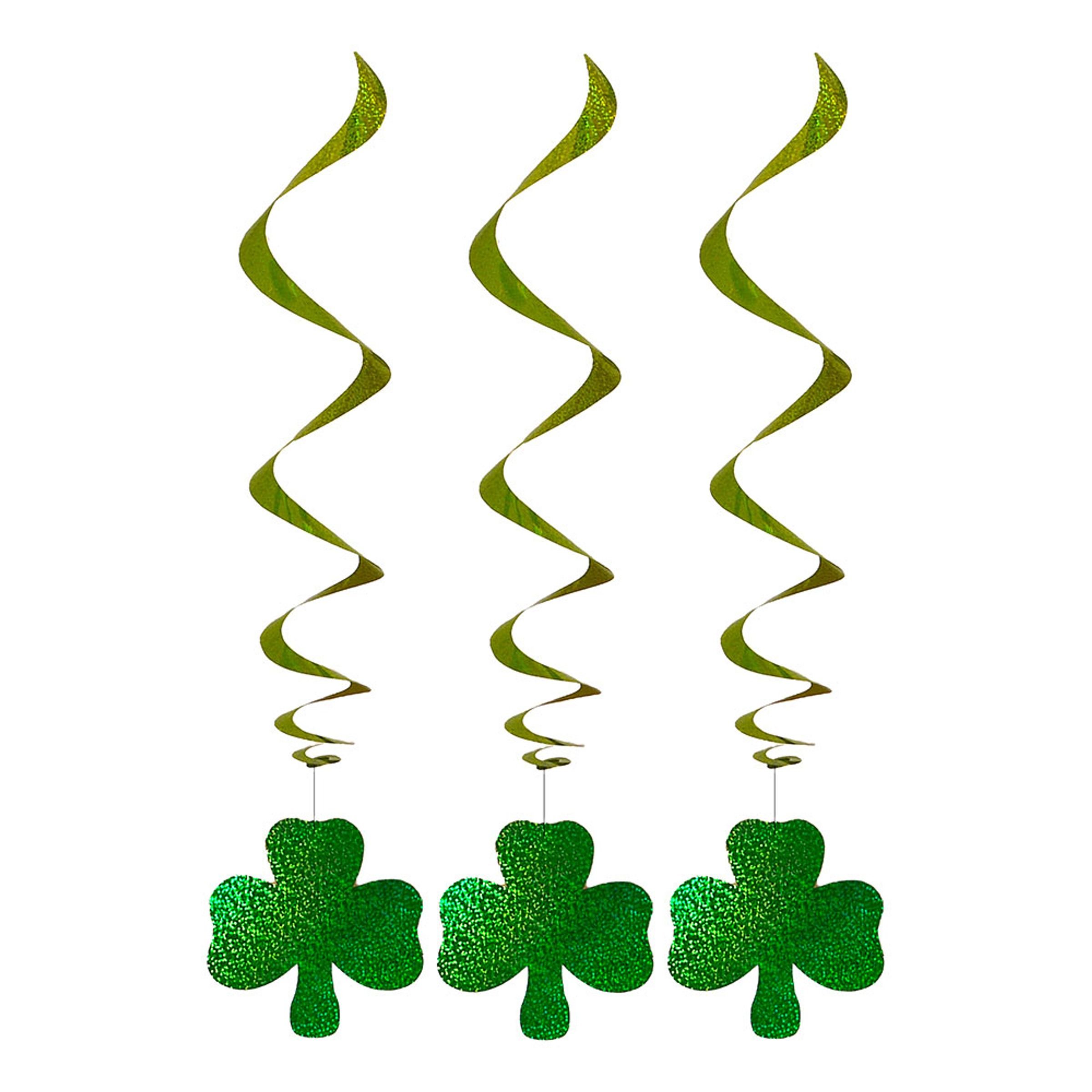 Swirls St Patrick´s Day Hängande Dekorationer är tre glittriga swirls med gröna treklöver längst ner. Swirlsen är i glittrande guldfärg och är av plastmaterial. Treklövern är också av plast och har skimrande och glittrig yta (dubbelsidiga).