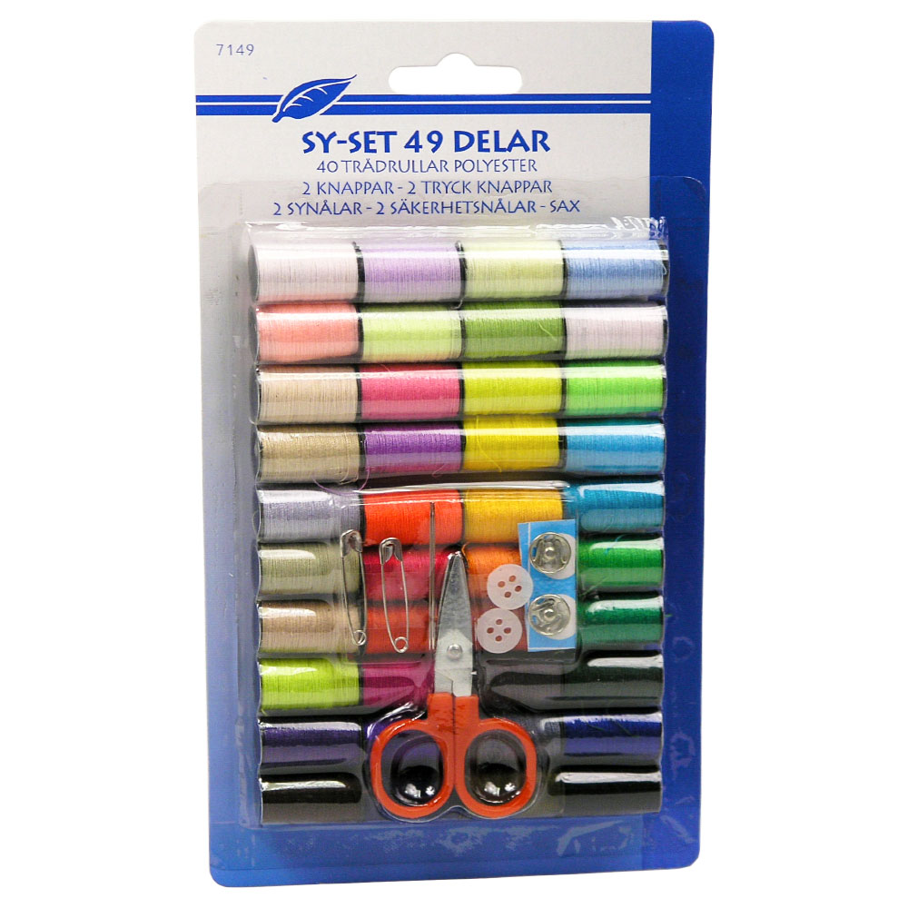 Här har du allt du behöver i ett litet sykit för att kunna laga favorittröjan som ungen gått loss på med en sax, du kan även sy fast den där knappen som lossnade runt dackefejden. Det finns säkert en och annan dragkedja du behöver byta ut också, så att skaffa ett syset är helt rätt väg att gå.