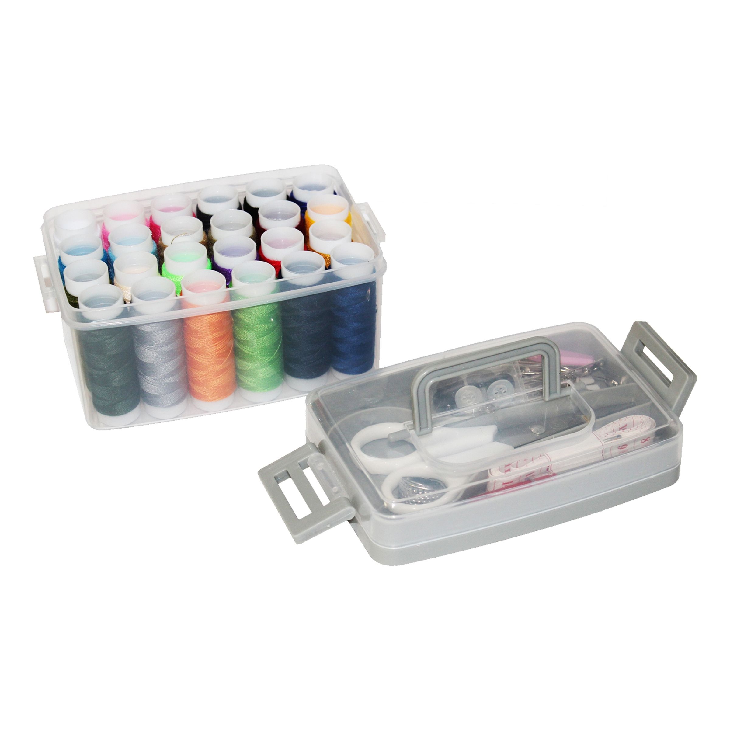 Sytillbehör i Låda inkluderar sytrådar i 24 olika färger, sax, knappar, synålar, måttband och mycket mer! Ett nödkit som behövs i alla hushåll.