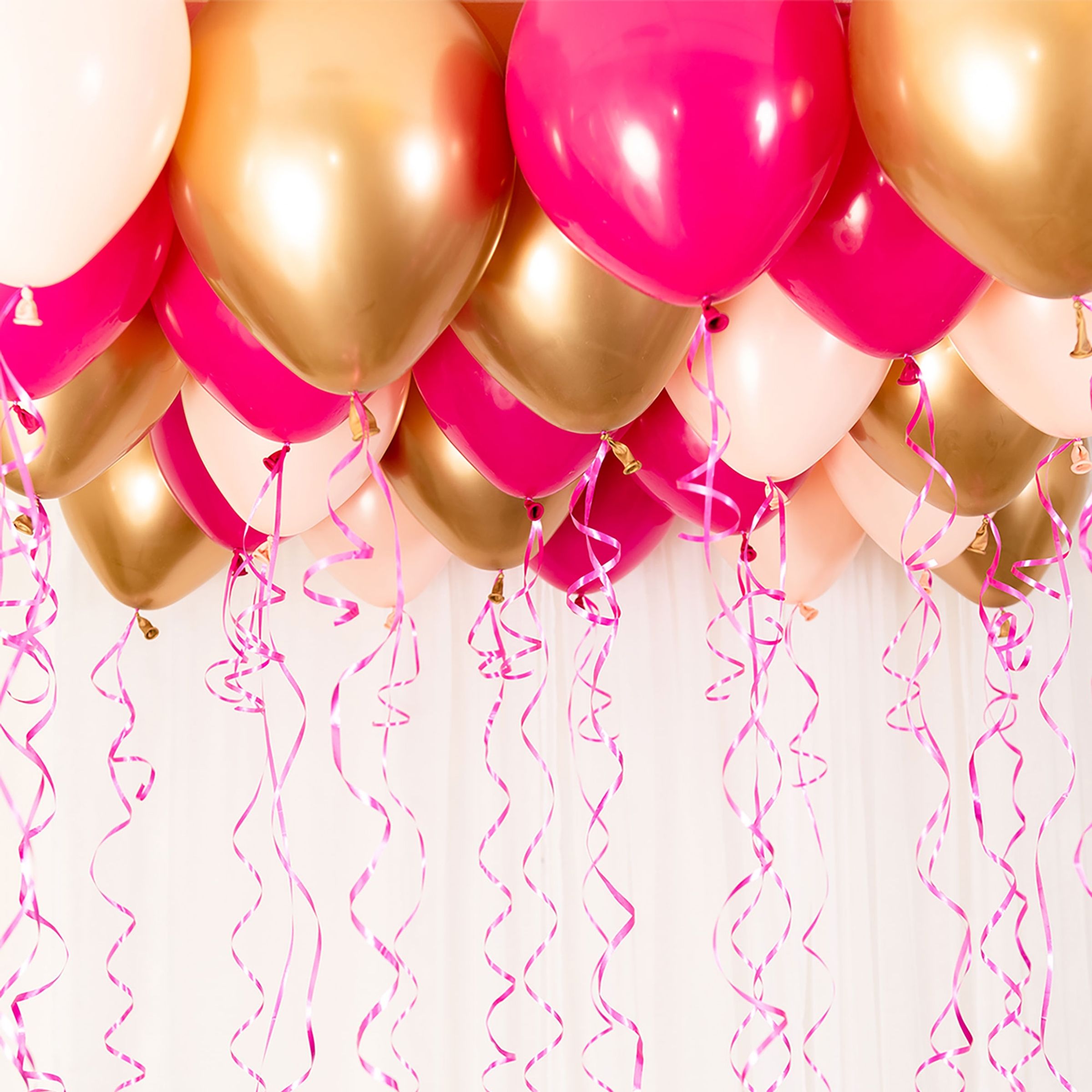 Takballonger Rosa/Guld trettio stycken rosa/vita/guldiga ballonger som fylls med med helium alternativ fästs i taket med hjälp av glue dots.