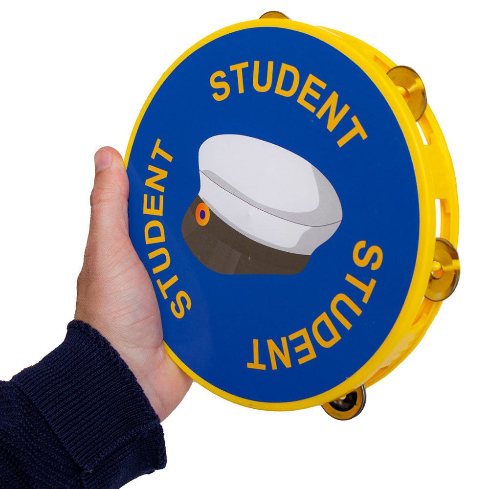 – Blå/Gul tamburin med studentmotiv.