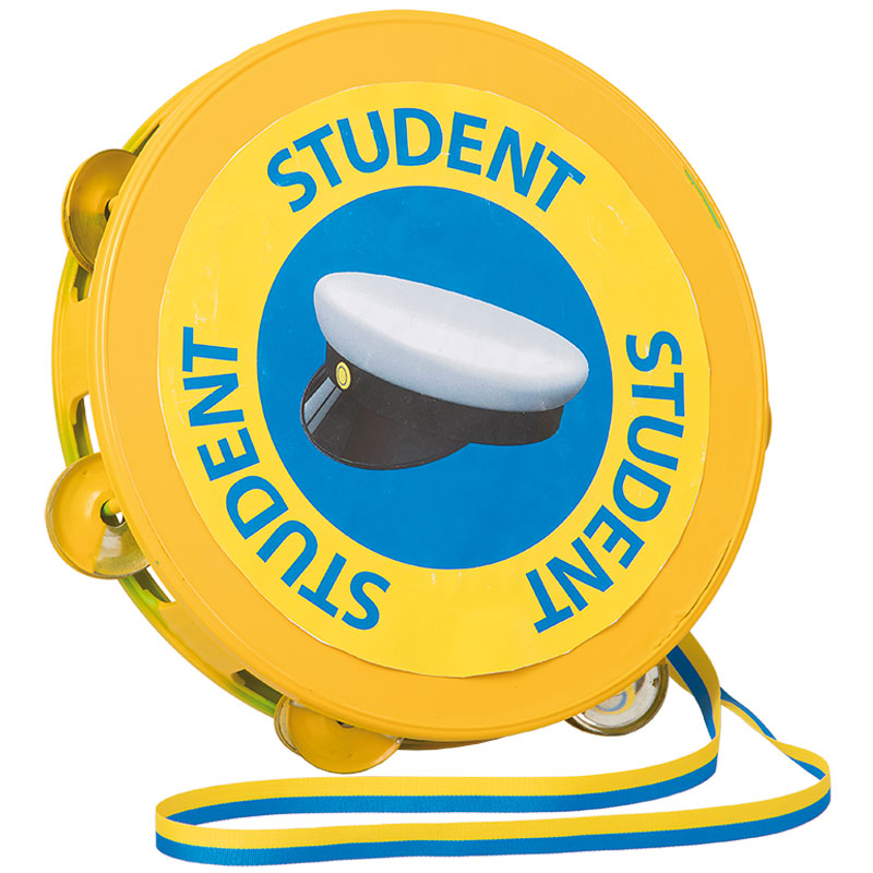 Tamburin Student omfattar en 20 cm stor, gul tamburin med motiv av en studentmössa samt texten "Student" i blått. Tamburinen har även ett blå-gult band som låter dig hänga den runt halsen.