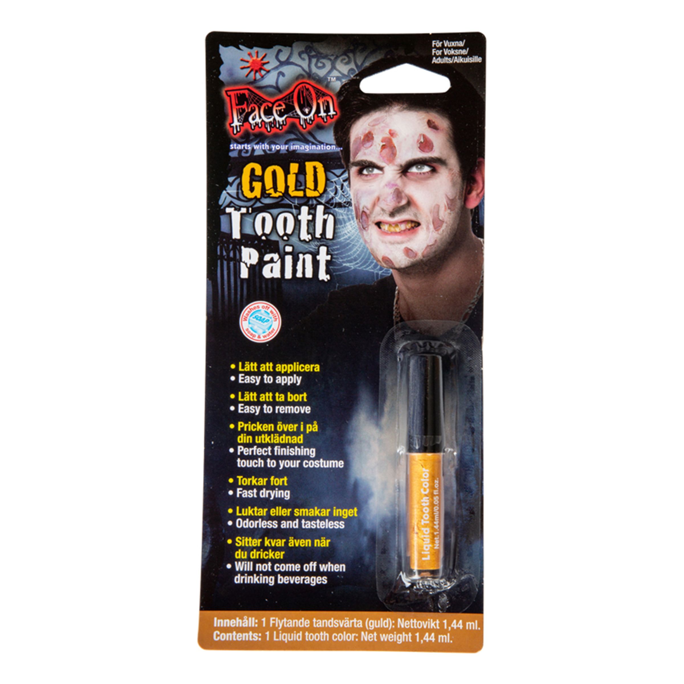 Tandfärg Guld består av flytande tandsvärta i färgen guld som enkelt appliceras på tänderna för att sätta pricken över i på din utklädnad. Färger har varken doft eller smak och sitter kvar även när du dricker.