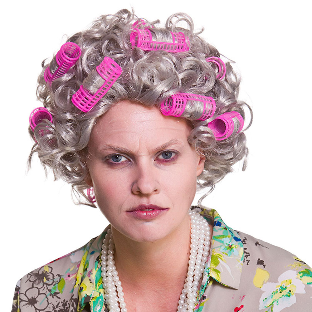 Tant Peruk med Rosa Papiljotter innehåller en grå, kort, lockig peruk med rosa papiljotter i.