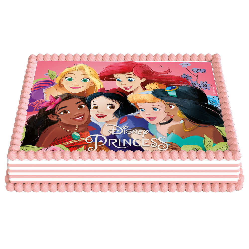 Tårtbild Disney Prinsessor Fyrkantig omfattar ett ätbart rektangulärt tårtoblat ark med motiv av disneyprinsessorna Snövit, Jasmine, Ariel, Askungen, Vaiana, Rapunzel att dekorera en tårta med. Ta av skyddet på baksidan och applicera sedan direkt på tårtan.