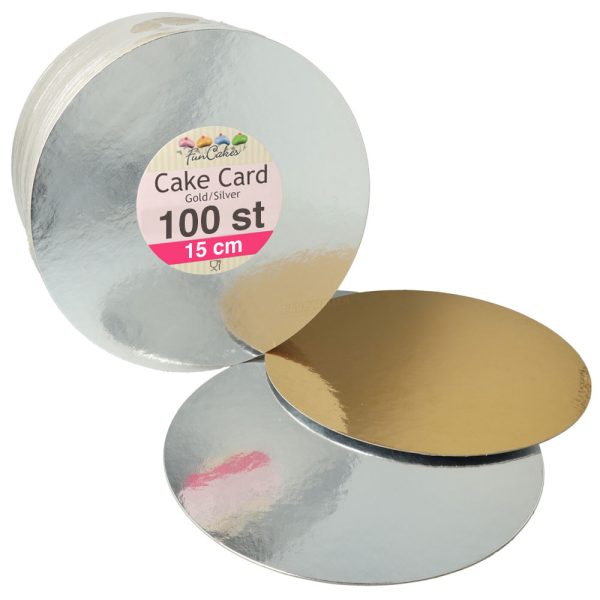 Tårtbrickor Silver och Guld 15 cm 100-pack består av tårtfat med en sida i silver och andra i guld. Tårtfaten mäter ungefär 15 centimeter i diameter. Säljs i 100-pack.