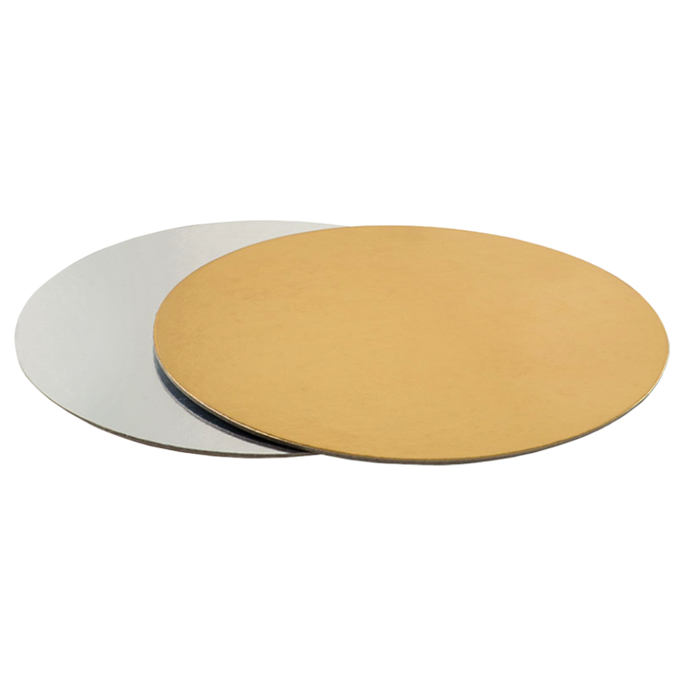 Info om Tårtbrickor Silver och Guld 28 cm 100-pack består av vändbara tårtunderlägg där ena sidan är guld och andra silver. Kan läggas mellan våningarna på en våningstårta. Skivan är tillverkad i papp och har en diameter på 28 centimeter. Säljs i 100-pack.