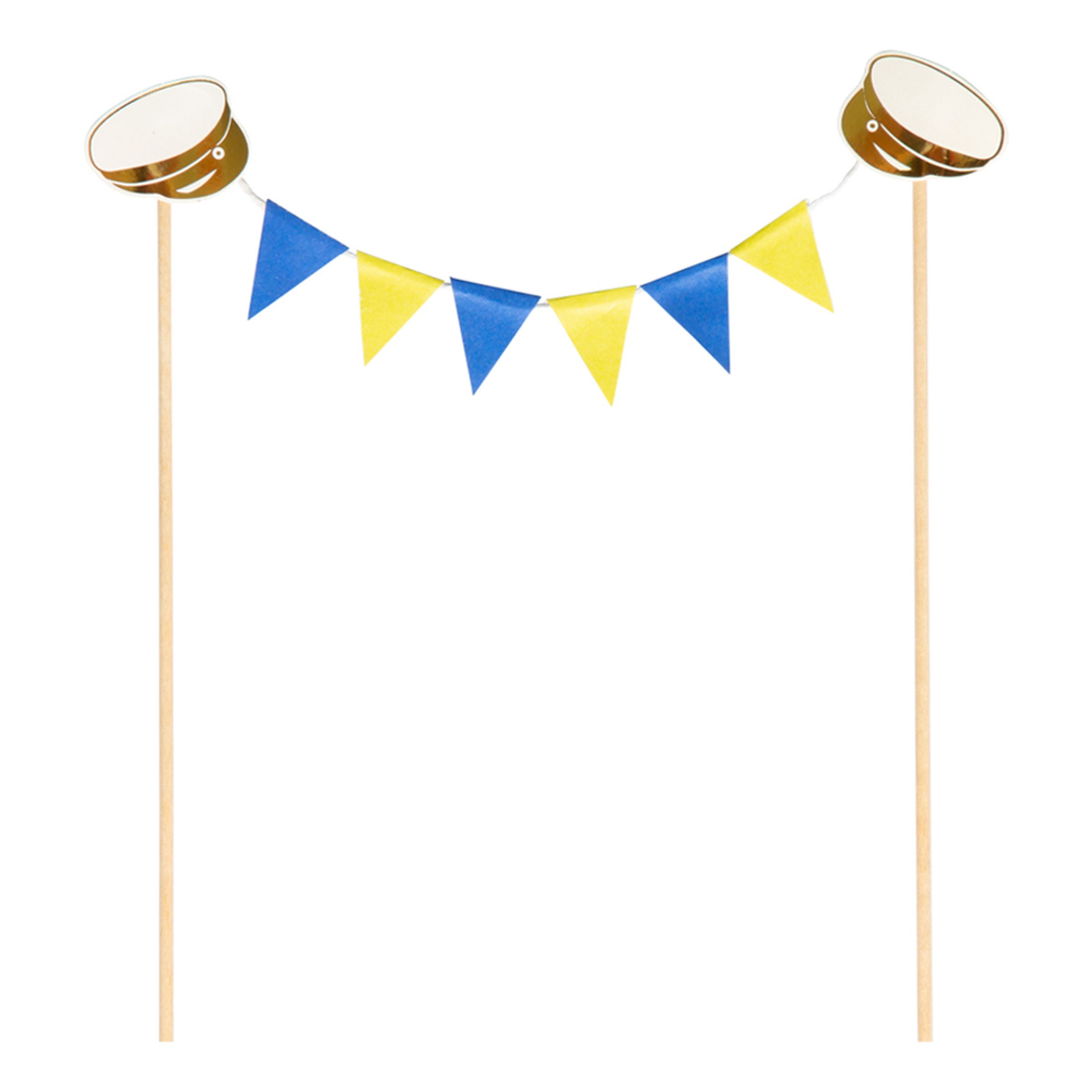 Tårtdekoration Blå/Gula Flaggor Student är en cake topper med blå/gula flaggor och en studenthatt i guldfolie som passar perfekt att dekorera studentens tårta, bakelser eller matbuffé med.