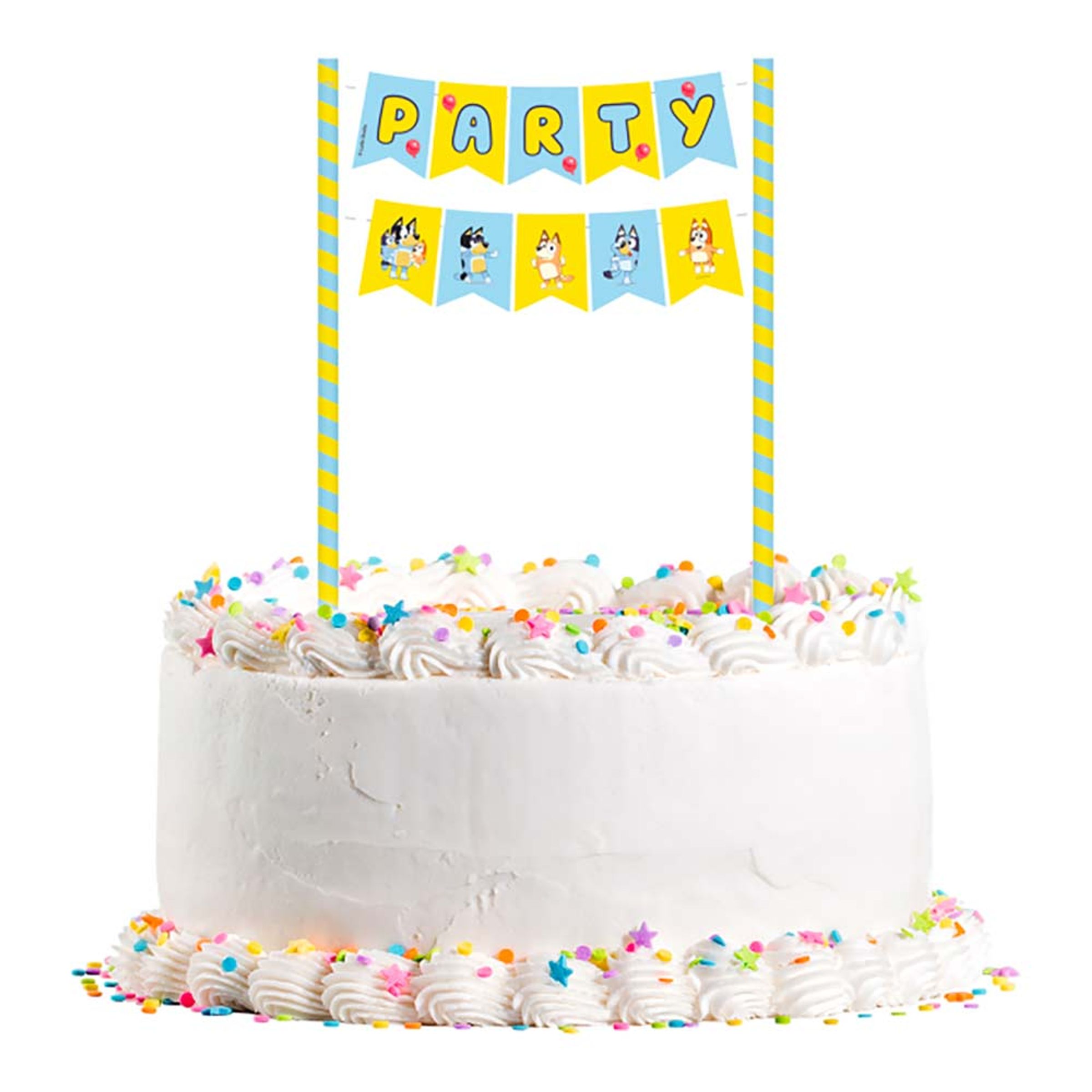 Hur gör man tårtan extra festlig? Genom att toppa med Bluey såklart! Den här festliga dekorationen har svajande vimplar som dinglar mellan två färgglada rör – och festligare än så kan det knappast bli!