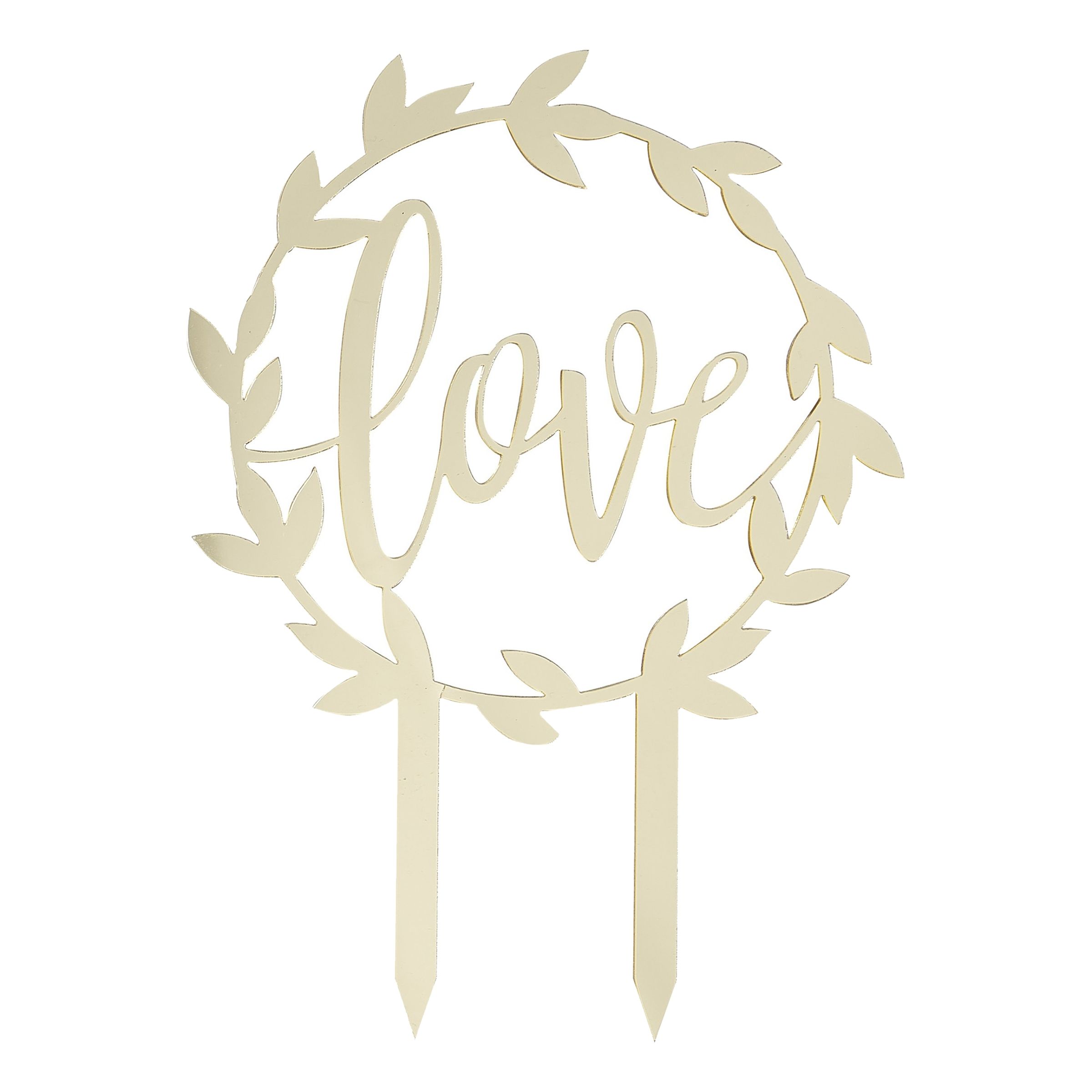 Tårtdekoration Bröllop Love mäter 15 cm x 20 cm och är tillverkad av akryl. Dekorationen piggar upp bröllopstårtan med sitt guldiga kärleksbudskap!