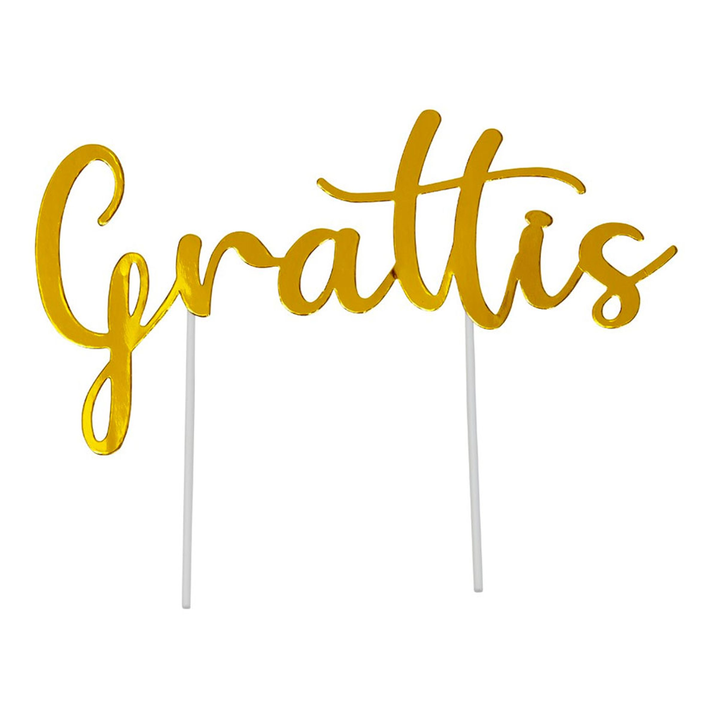 Tårtdekoration Grattis Guld är en guldig tårtdekoration med texten "Grattis". Tillverkad av papp och mäter ca 26,3 cm inklusive tandpetarna som sätts i tårtan. Säljs styckvis.