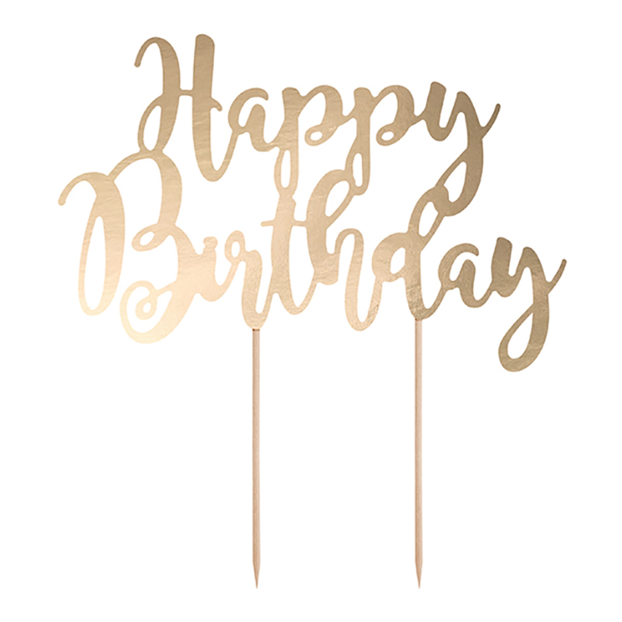 Tårtdekoration Happy Birthday Guld är en guldfärgad tårtdekoration i papper som är 22,5 cm hög. Texten som utgör dekorationen är "Happy Birthday".