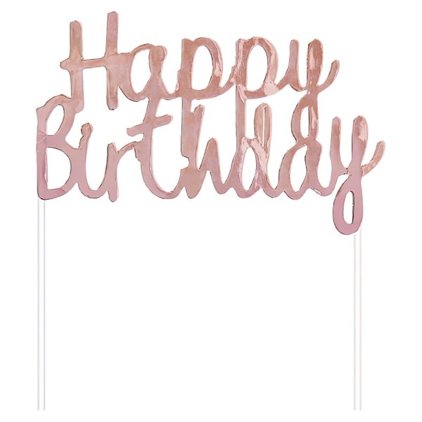 Tårtdekoration Happy Birthday Roséguld omfattar en tårtdekoration i form av texten "Happy Birthday" i glänsande roséguld. Dekorationen är ca 11 x 11 cm stor och har långa vita plastpinnar som gör det enkelt att fästa den i tårtan.