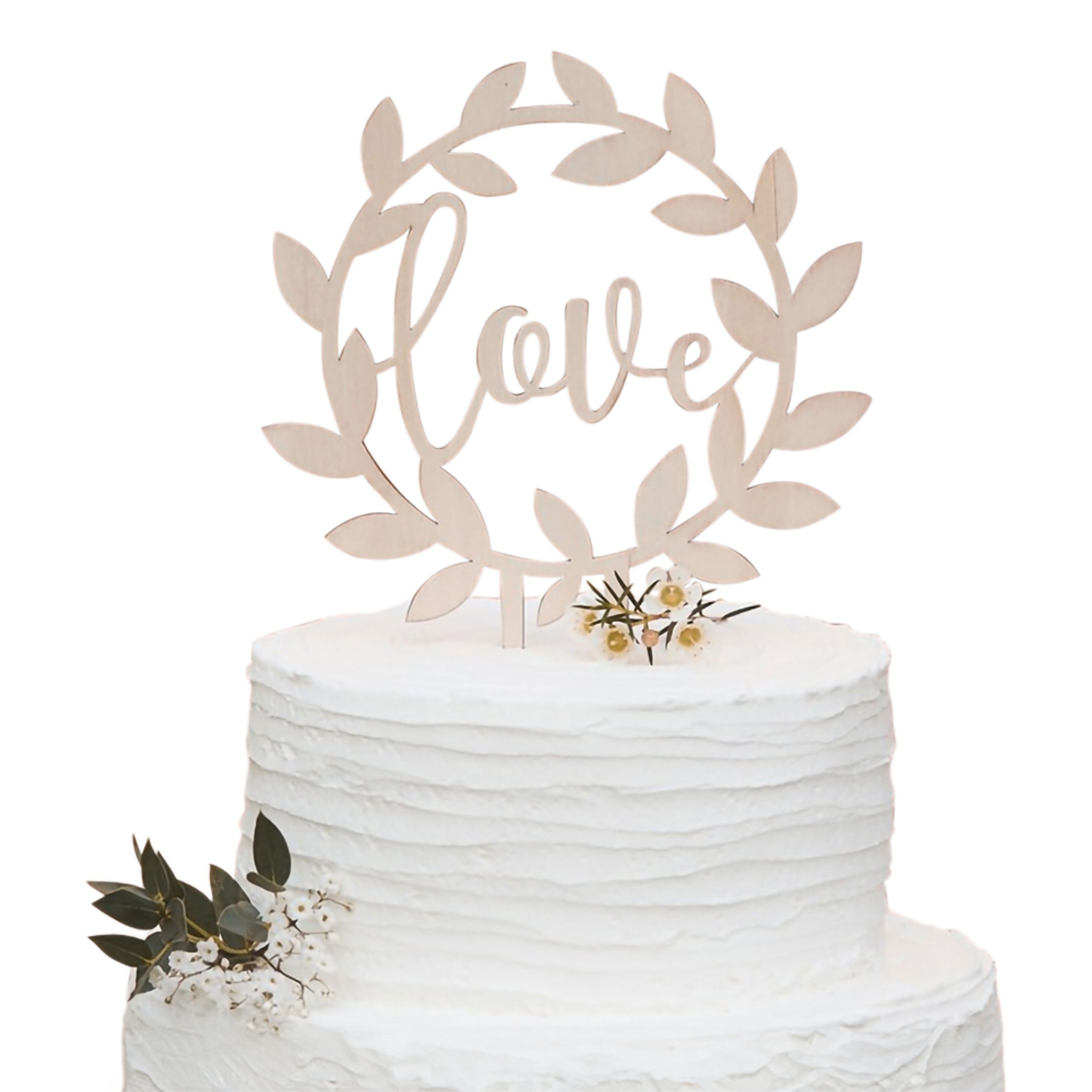 Tårtdekoration Love Rustik innehåller en tårtdekoration med utskuren text och med en krans runt texten. På tårtdekorationen står det "Love". Den är 15 x 19 cm stor och tillverkad i trä.