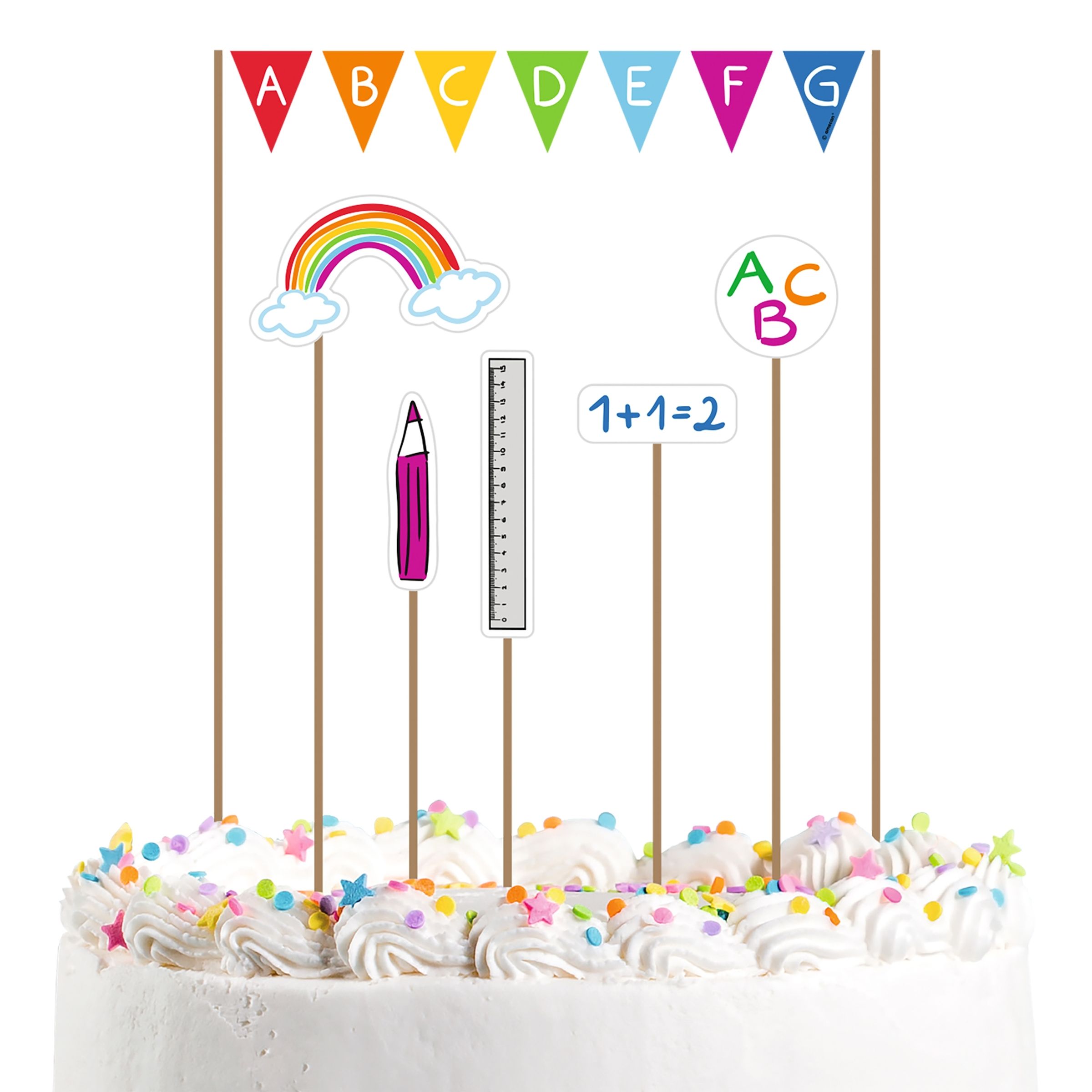 Tårtdekorationer Skolstart inkluderar totalt sex stycken olika dekorationer med motiv inspirerat av skolbänken. Dekorationerna sticks enkelt ner i tårtan eller annan bakelse du bjuder på till skolstart-kalaset.