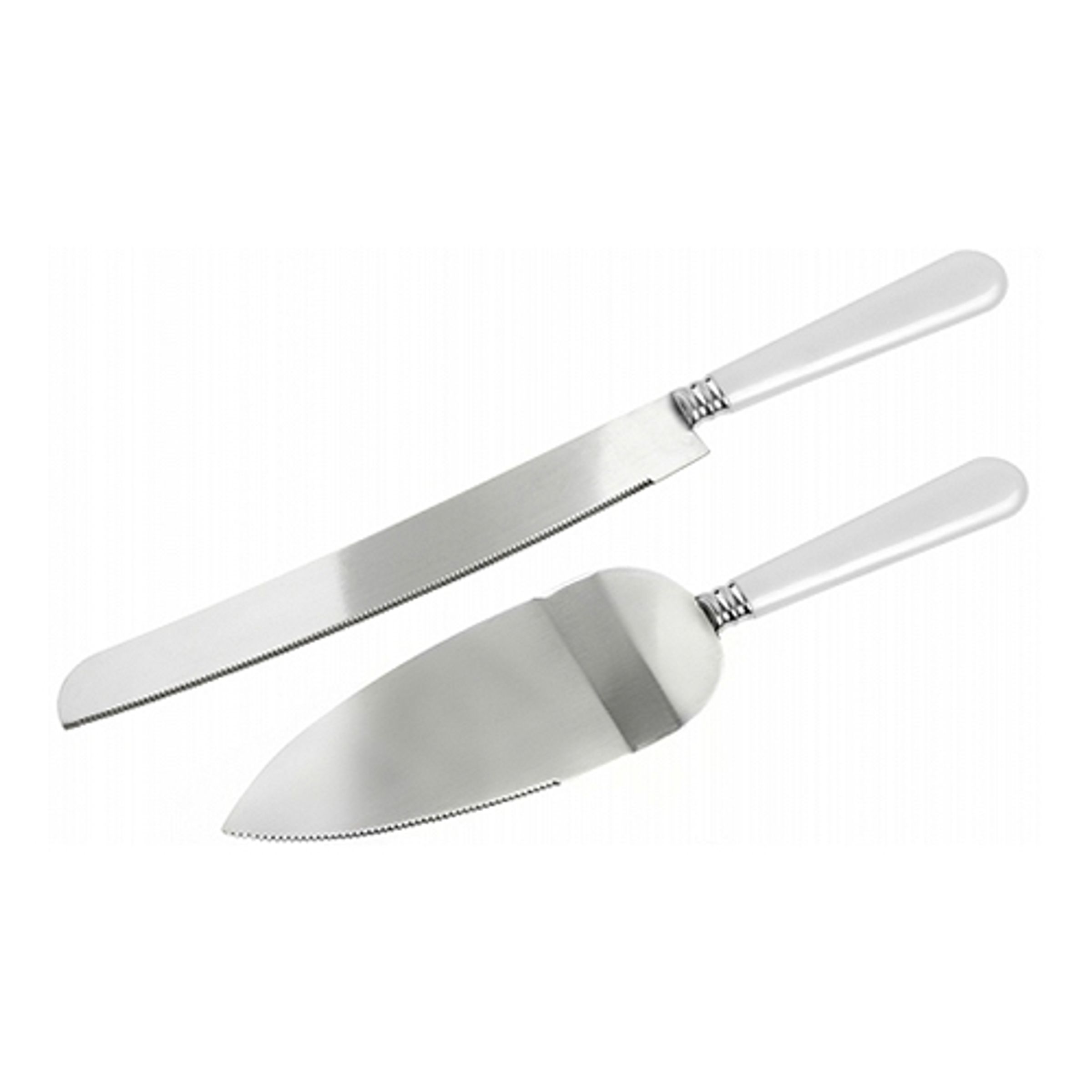 Tårtkniv och Spade Vit har ett vitt handtag i plast med känslan av prälemor, samt blad i rostfritt stål. Levereras parvis med en kniv och en spade.