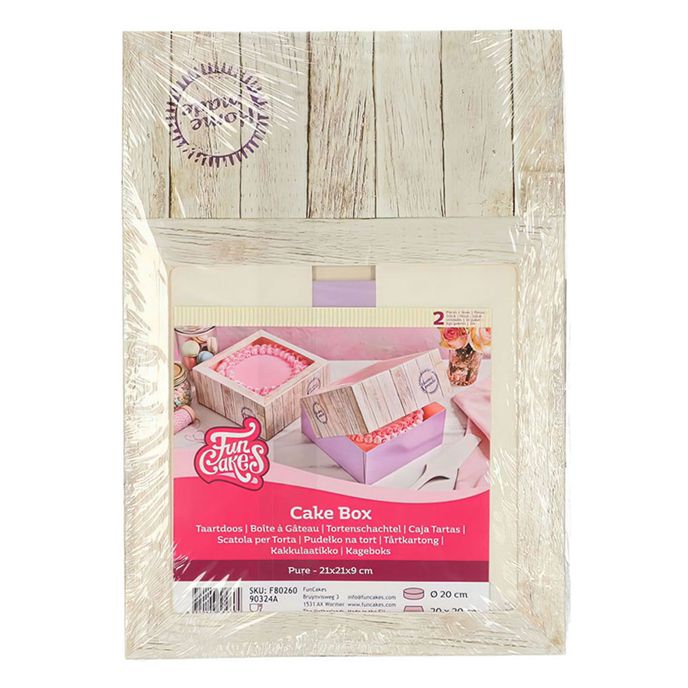 Cake Box Home Made är en mycket fin tårtkartong i trälook med fönster som är idealisk att slå in och transportera tårtor och andra bakverk i. I hemmagjorda tårtor finns extra mycket kärlek och omtanke och just därför borde de alltid ha speciella tårtkartonger som skyddar! Denna tårtlåda har en underdel som är rosa på insidan och lila på utsidan.