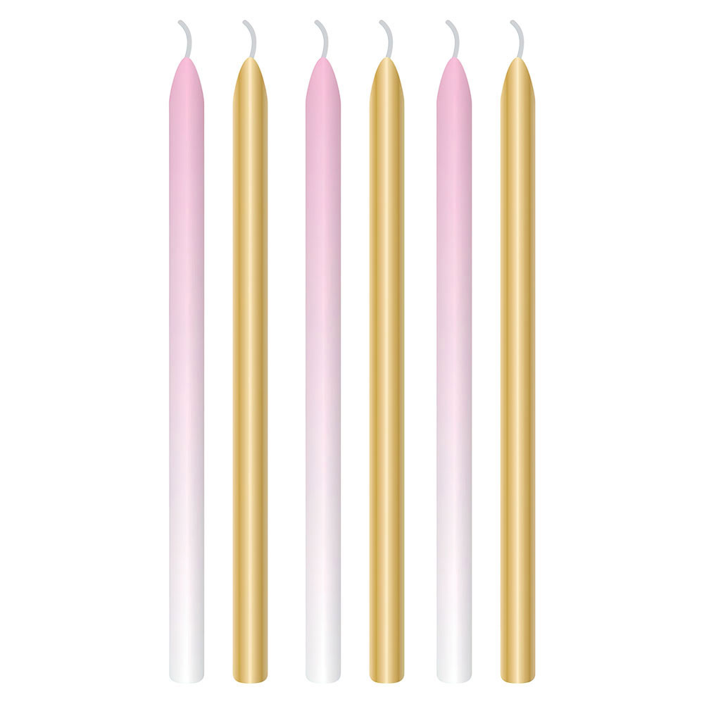 Tårtljus 1st Birthday Ombre Ljusrosa omfattar ett 6-pack smala tårtljus i guld och ljusrosa med ombre-effekt. Tårtljusen är ca 12 cm långa och kommer med hållare av plast som gör dem enkla att sticka ner i tårtan.