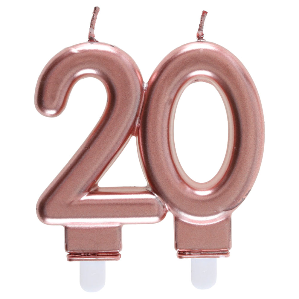 Tårtljus 20 Roseguld omfattar ett roseguldigt tårtljus i form av siffran 20. Tårtljuset är ca 8 cm högt och 7,5 cm brett, och är försett med små plastpinnar som enkelt håller det på plats på tårtan.
