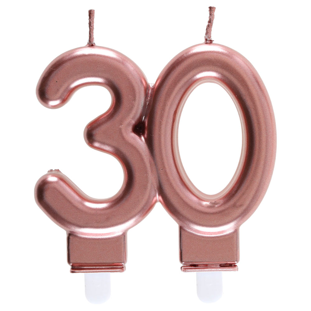 Tårtljus 30 Roseguld omfattar ett roseguldigt tårtljus i form av siffran 30. Tårtljuset är ca 8 cm högt och 7,5 cm brett, och är försett med små plastpinnar som enkelt håller det på plats på tårtan.