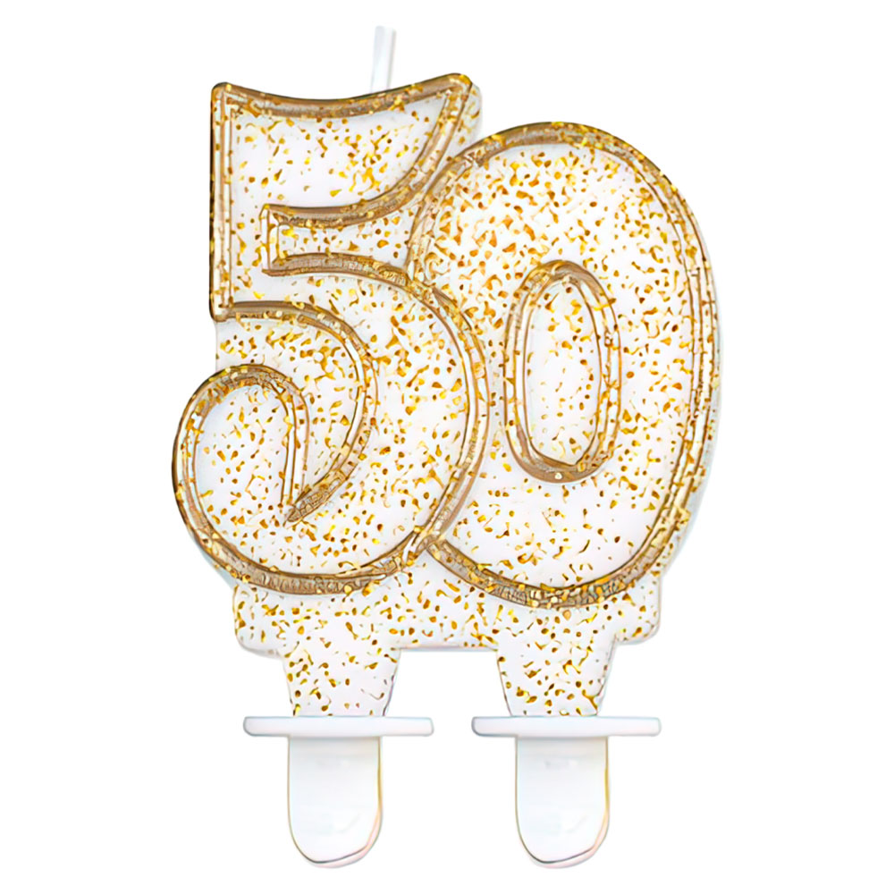 Tårtljus 50 år Glitter omfattar ett 9 cm stort, vitt tårtljus i form av texten "50" med guldigt glitter.