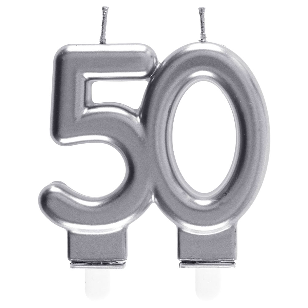 Tårtljus 50 Silver omfattar ett silvrigt tårtljus i form av siffran 50. Tårtljuset är ca 8 cm högt och 7 cm brett och är försett med små plastpinnar nedtill som gör det enkelt att fästa det i tårtan.