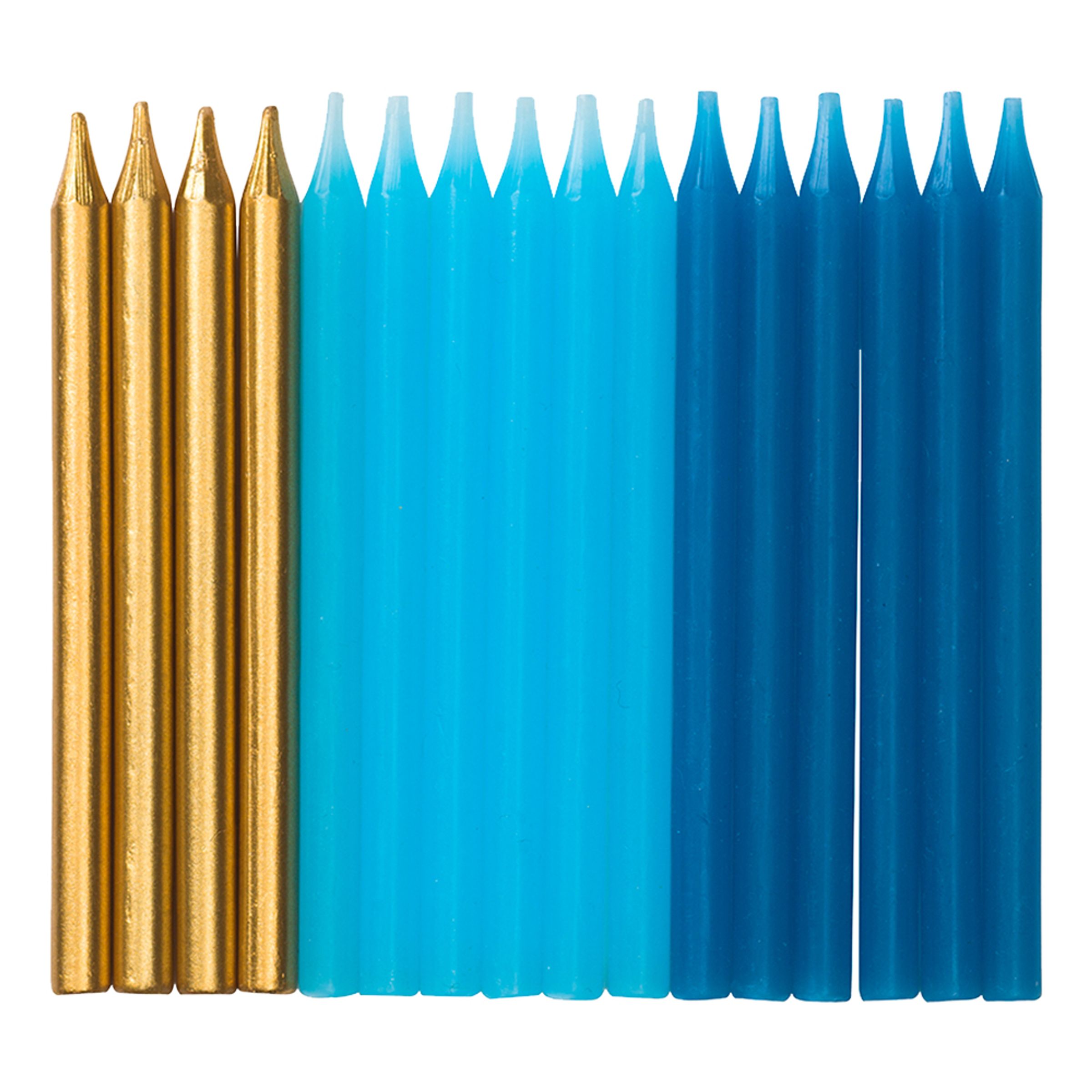 Tårtljus Blå/Guld är ett gäng tårtljus i nyanserna guld, ljusblått och mörkblått. Använd dem var för sig eller tillsammans för att få en läcker dekoration på tårtan. Perfekt till dopet, baby showern eller kalaset!
