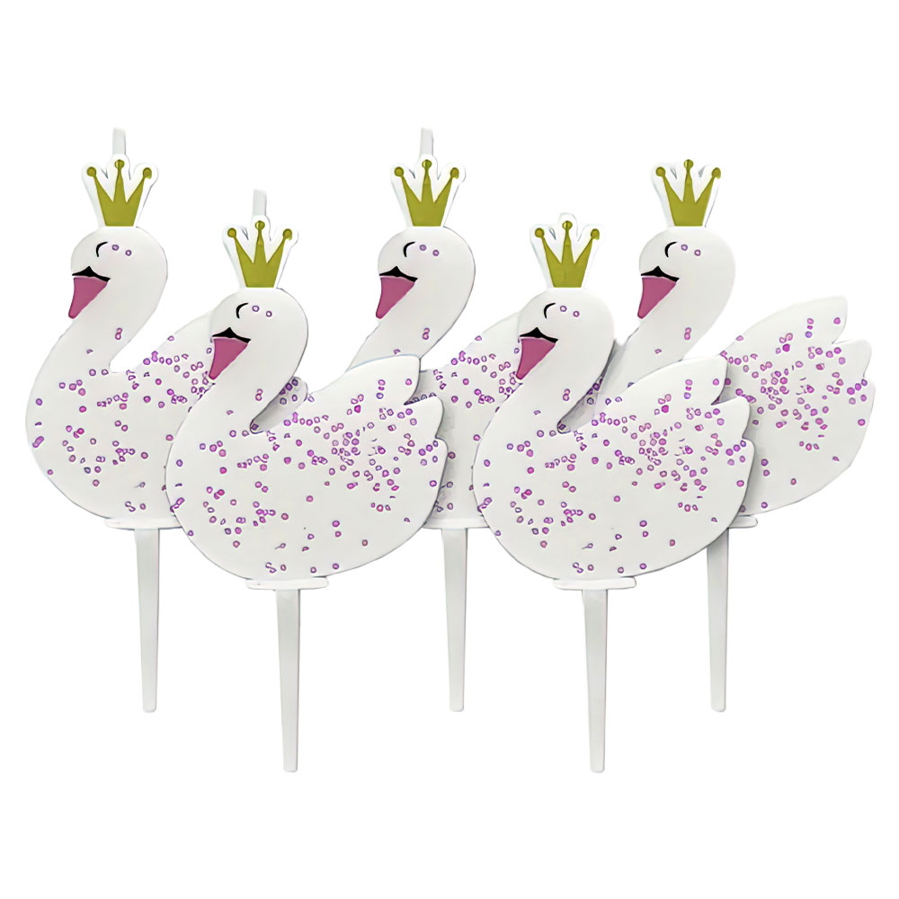 Tårtljus Glitter Swan omfattar 5 st tårtljus i form av vita svanar med rosa glitter. Ljusen är ca 6,7 cm långa och är försedda med plastpinnar som gör de enkla att sticka ner i tårtan.