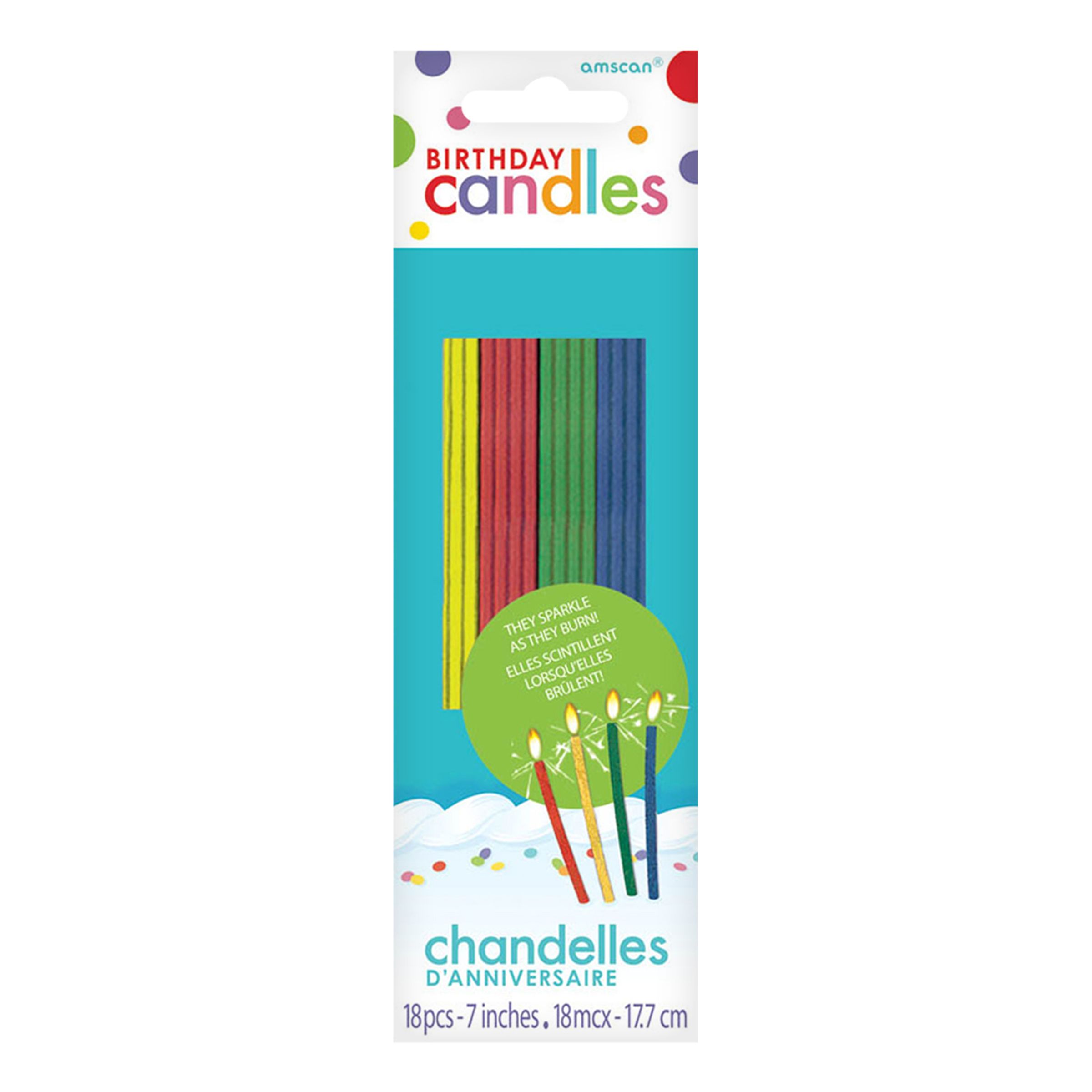 Tårtljus Gnistrande Flerfärgade är långa smala tårtljus i färgerna gul, blå, grön och röd som gnistrar när de är tända. Supercoolt! Bara att sticka ner i tårtan och tända!