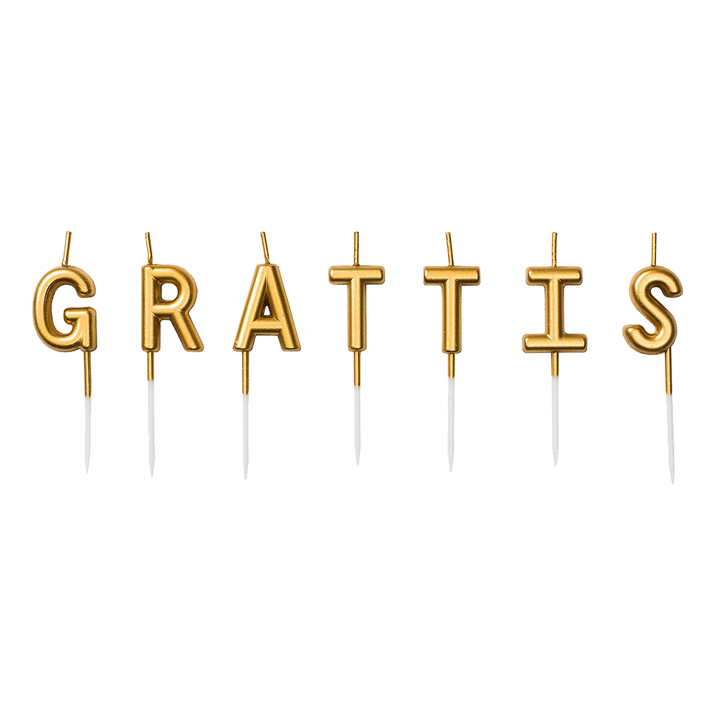 Tårtljus Grattis Guld inkluderar bokstavsljus som utformar ordet "GRATTIS". Passar perfekt när ni ska fira något speciellt; födelsedag, förlovning, nytt jobb? Allt ska firas!!