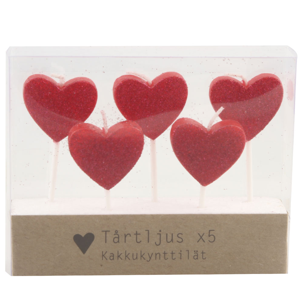 Tårtljus Hjärtan 5-Pack omfattar fem stycken hjärtformade, röda tårtljus.