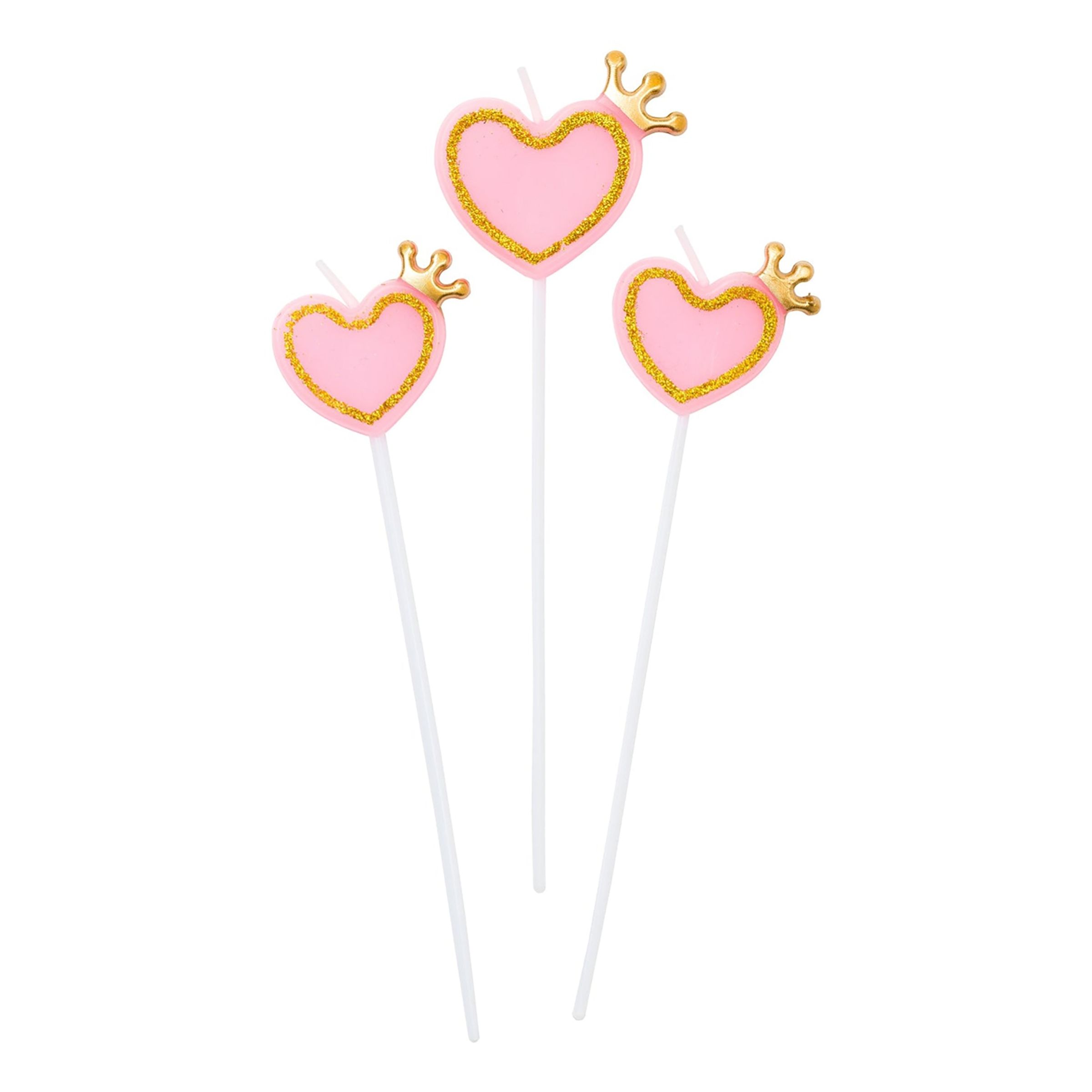 Tårtljus Hjärtan med Krona inkluderar tre stycken tårtljus i form av hjärtan med en guldkrona ovanpå. Hjärtana kommer i två olika storlekar, två små och en större.