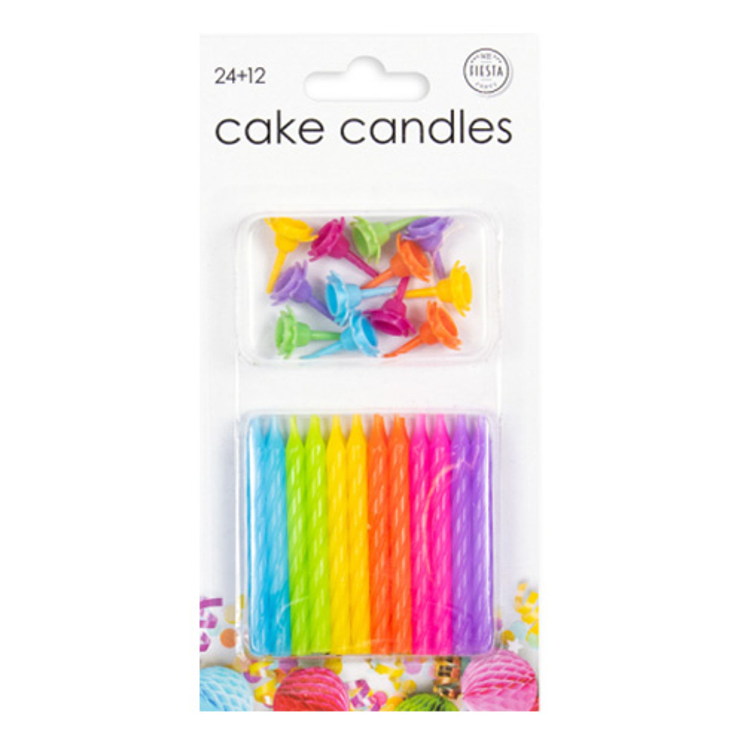 Tårtljus med Hållare Flerfärgade inkluderar 24 stycken tårtljus i olika färger och tolv tårtljushållare. Ljusen är tillverkade i vax och är 0,5 x 5,8 cm stora. Tårtljushållarna är tillverkade i plast.