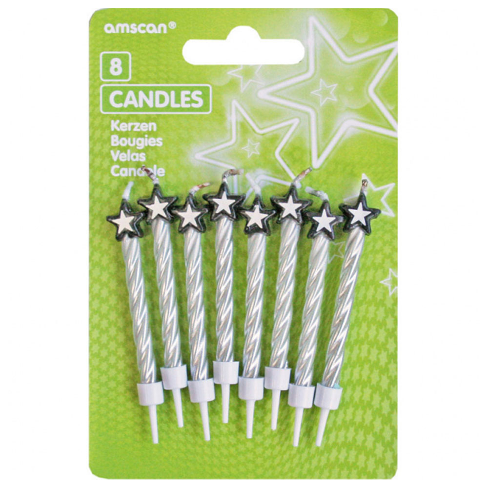 Tårtljus med Stjärnor Silver innehåller ett 8-pack tårtljus med stjärnor upptill i svart och silver.