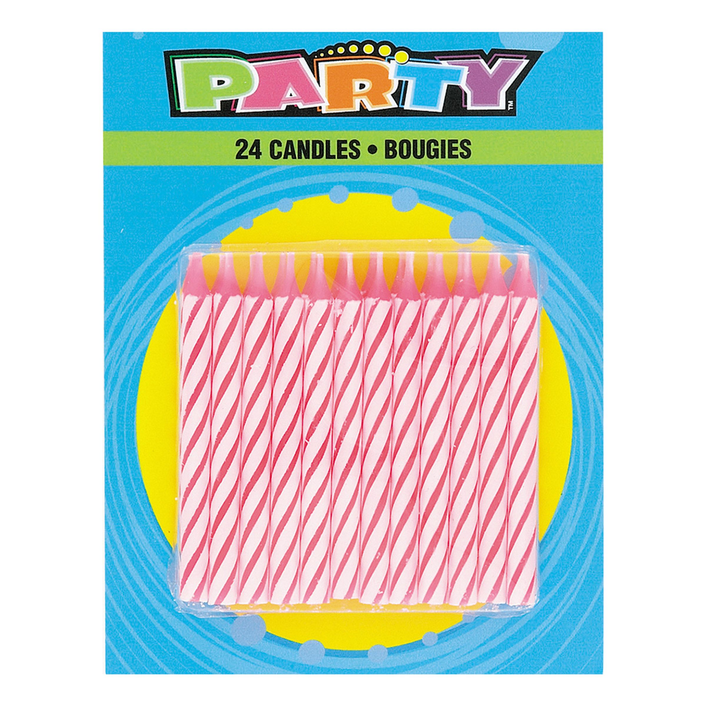 Tårtljus Rosa Randiga är ett 24-pack med vridna tårtljus i vitt och rosa. Tänk på att om födelsedagsbarnet fyller 25 eller mer behöver ni flera paket ljus om ni vill att antalet ljus i tårtan ska stämma överens med födelsedagsbarnets blivande ålder.