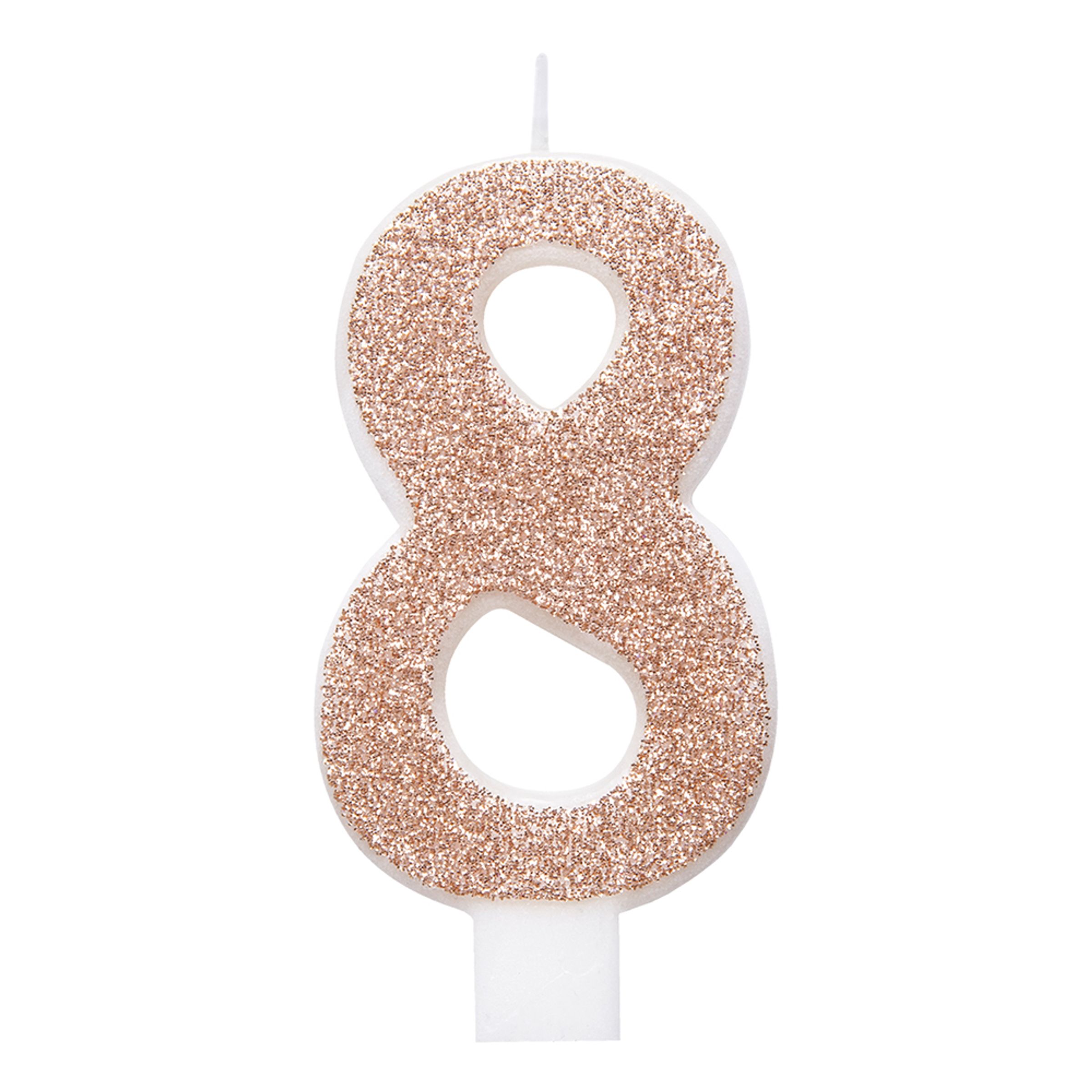 Tårtljus Roséguld/Glitter levereras styckvis och finns i siffrorna 0-9. Varje siffra kommer i färgen roséguld med en glittrig yta och själva ljuset är tillverkat i stearin. Mått: cirka 7,5 cm.
