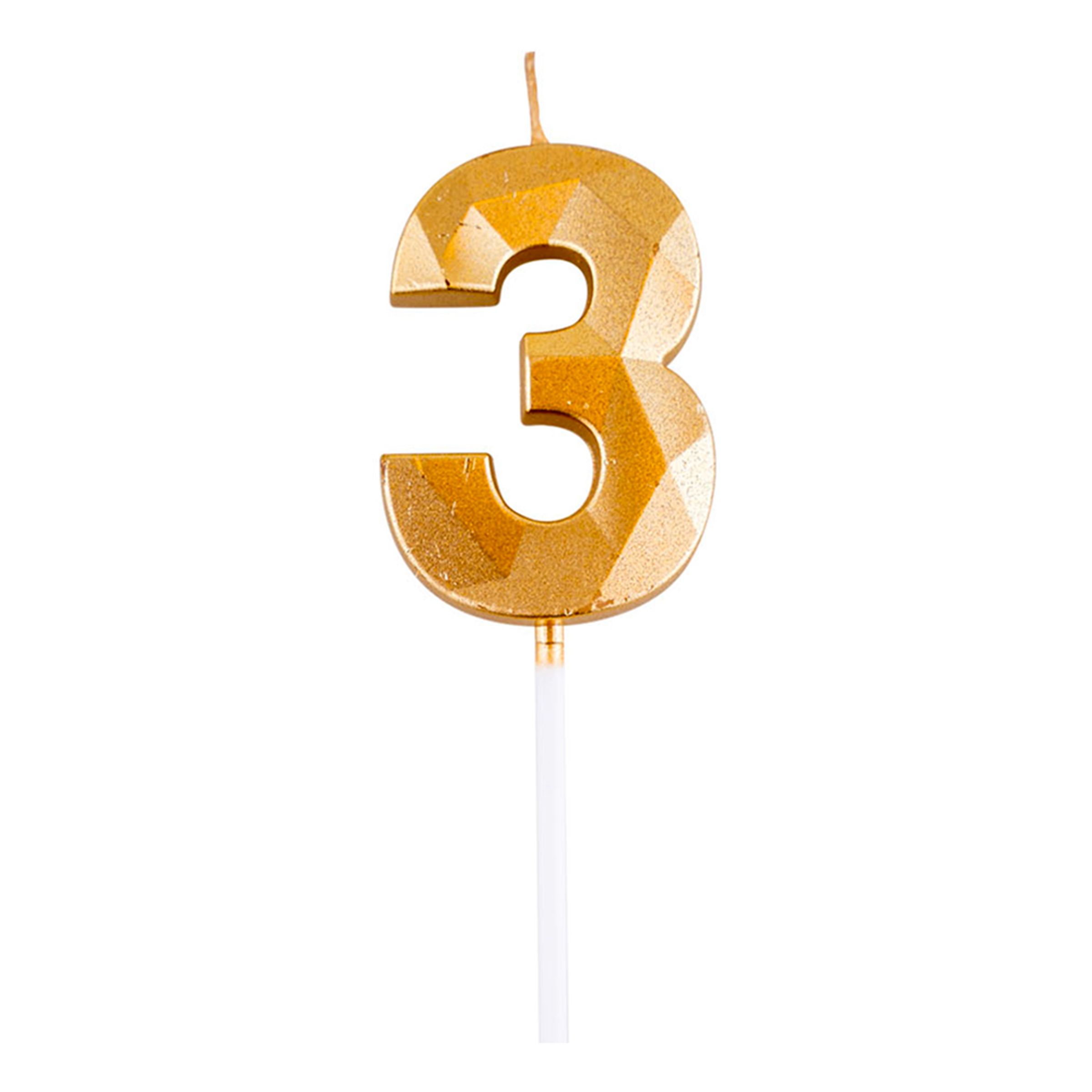 Tårtljus Siffra Diamond Guld är ett guldfärgad tårtljus format som siffrorna 0-9 och kommer med en design som påminner om en slipad diamant. Kombinera flera siffror för att bilda ett passande siffertal för tillställningen!